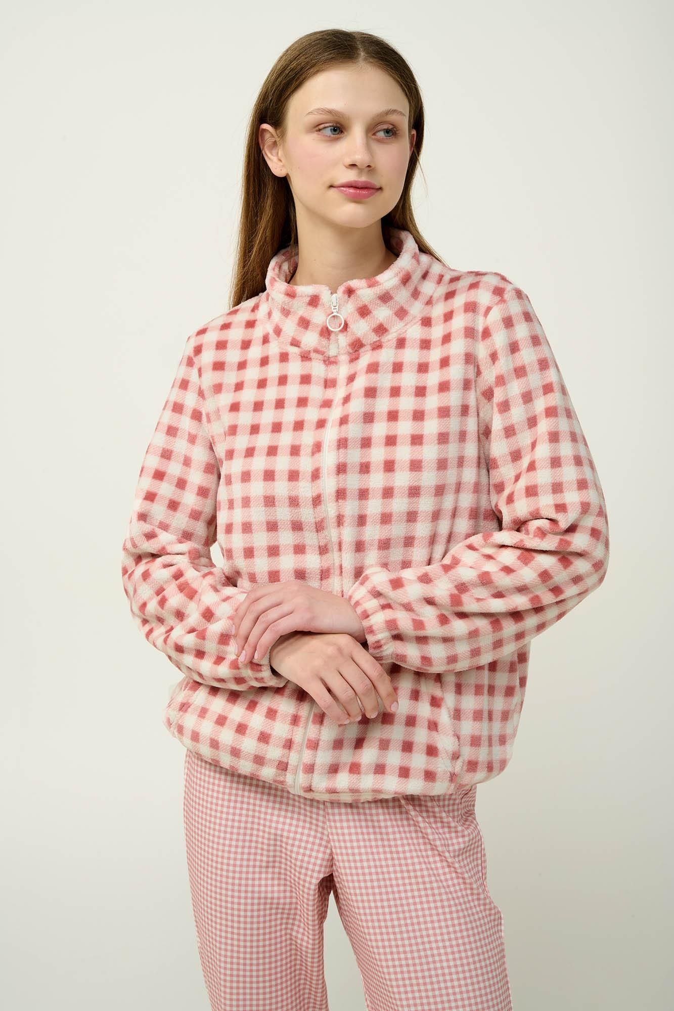 Αυτή η γυναικεία ρόμπα σε διακριτικό ροζ καρό μοτίβο είναι ιδανική για τις κρύες μέρες του χειμώνα. Κατασκευασμένη από μαλακό fleece, προσφέρει απαλή και ζεστή αίσθηση στο δέρμα που διαρκεί όλη την ημέρα. Κλείνει με φερμουάρ, ενώ οι δύο μπροστινές τσέπες προσθέτουν άνεση και πρακτικότητα, κρατώντας τα χέρια σας ζεστά ή αποθηκεύοντας μικρά προσωπικά αντικείμενα. Ιδανική για να τη φορέσετε πάνω από τις αγαπημένες σας πυτζάμες για να απολαύσετε ένα ήρεμο πρωινό ή ένα χαλαρό απόγευμα.μπα με Φερμουάρ