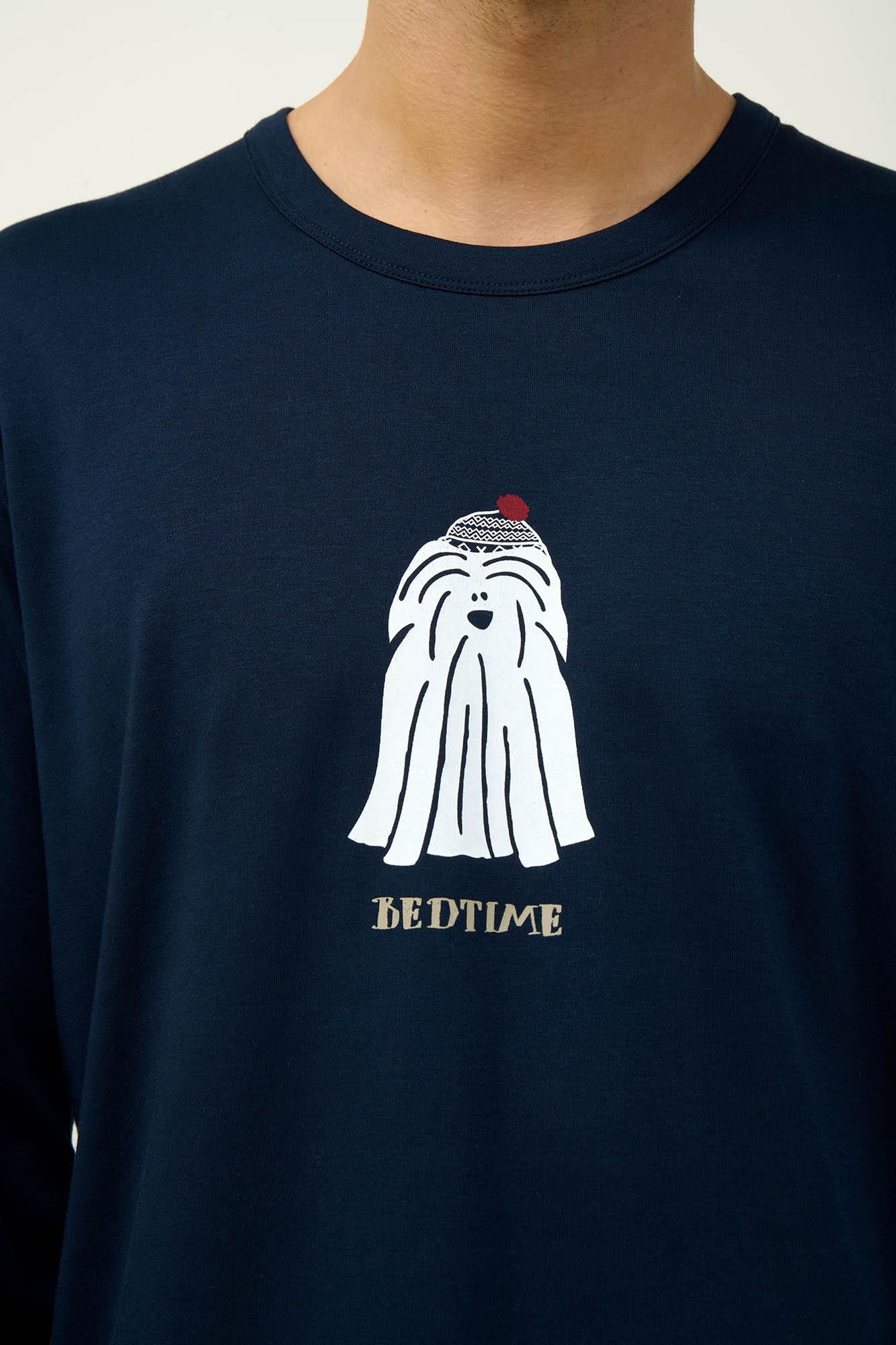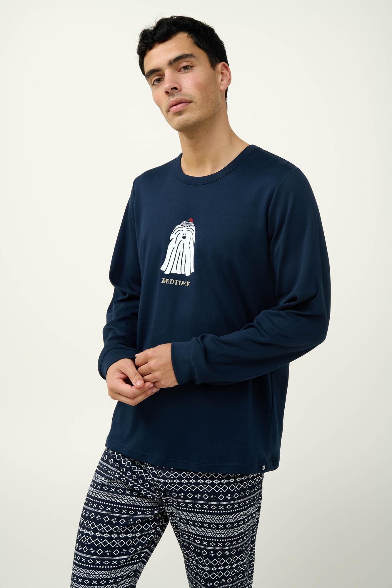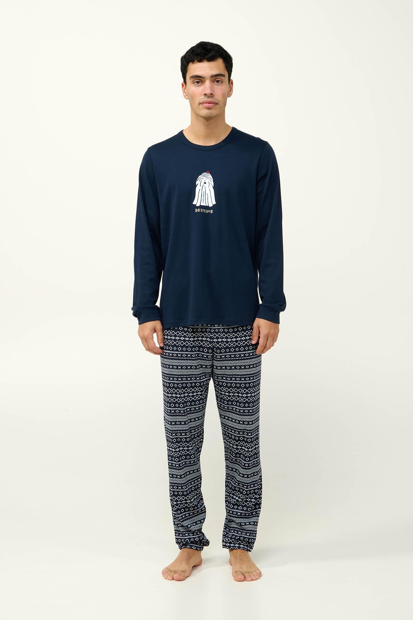 Ανακαλύψτε τον ιδανικό σας σύντροφο για το χειμώνα σε αυτές τις ανδρικές πυτζάμες, φτιαγμένες από 100% βαμβάκι interlock που προσφέρει απαλή και διαπνέουσα αίσθηση, ιδανική για τις κρύες νύχτες. Το πάνω μέρος έχει μανίκια με μανσέτες και ένα χαριτωμένο τύπωμα στο στήθος. Το παντελόνι έχει μανσέτες στο τελείωμα και είναι διακοσμημένο με ένα γεωμετρικό σχέδιο που θυμίζει σκανδιναβικό μοτίβο, προσθέτοντας μια κλασική νότα στο σύνολο. Απολαύστε κάθε στιγμή στο σπίτι με άνεση και στύλ.