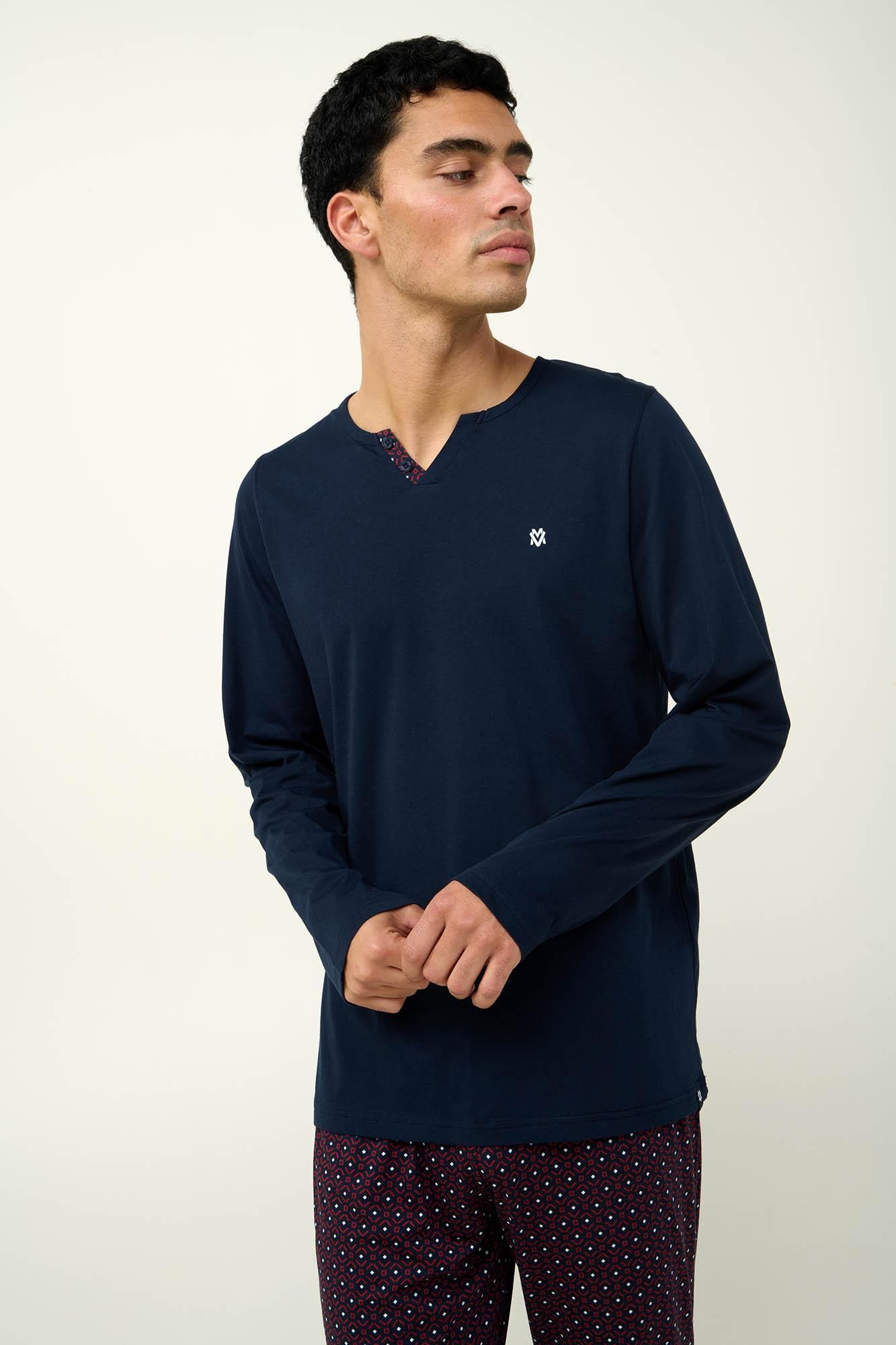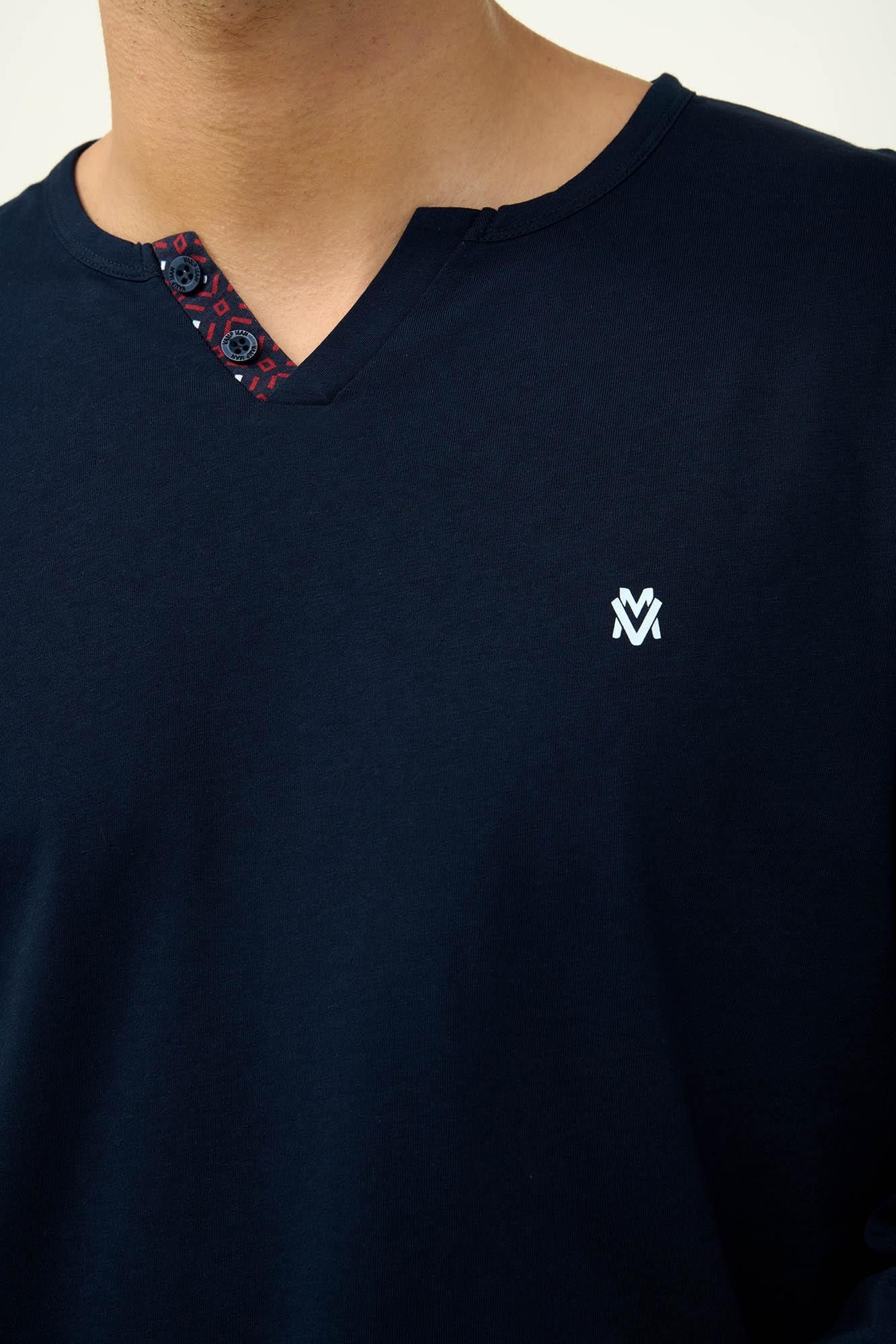 Ανανεώστε τηn γκαρνταρόμπα σας με αυτό το κλασικό σετ ανδρικές πυτζάμες από 100% βαμβάκι s. jersey που προσφέρει άνετη εφαρμογή και απαλή υφή, ιδανική για χαλάρωση ή ύπνο. Το μονόχρωμο πάνω μέρος συνδυάζεται αρμονικά με ένα παντελόνι που φέρει επαναλαμβανόμενο γεωμετρικό μοτίβο, δημιουργώντας ένα ισορροπημένο και διαχρονικό σύνολο. Ένα σετ σχεδιασμένο για να απολαύστε ένα όμορφο απόγευμα στο καναπέ ή ένα χαλαρό πρωινό.