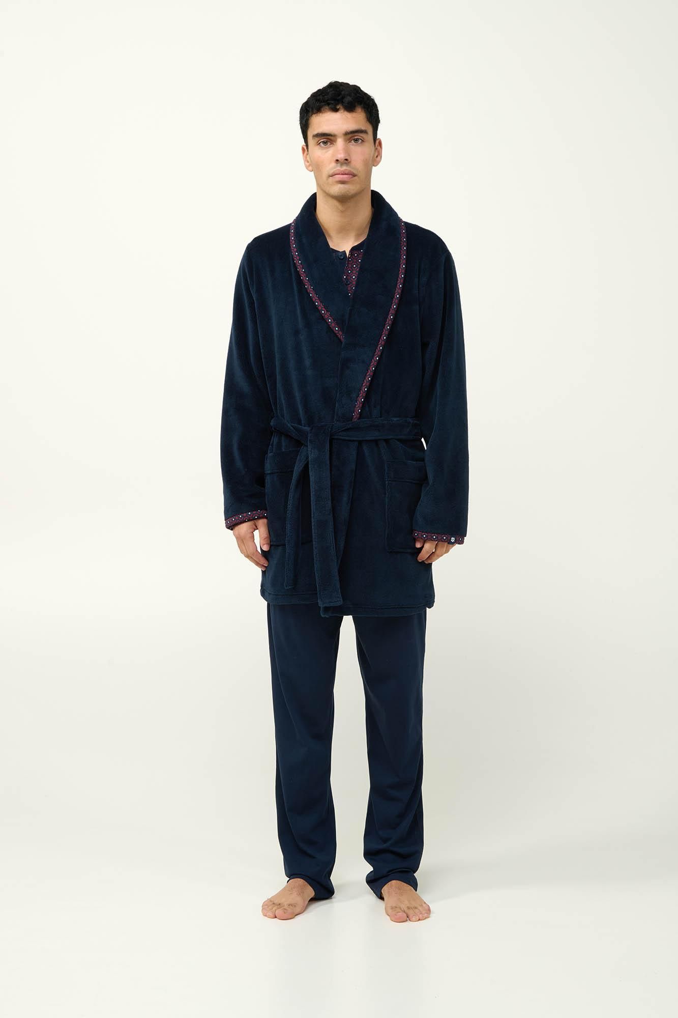 Επιλέξτε μια σταυρωτή ανδρική ρόμπα για να συνοδέψετε τις αγαπημένες σας πυτζάμες. Ένα κλασικό σχέδιο που κλείνει με ζώνη μπροστά και έχει πρακτικές τσέπες που σας επιτρέπουν να έχετε κοντά σας προσωπικά αντικείμενα. Το πέτο είναι διακοσμημένο με ένα επαναλαμβανόμενο γεωμετρικό μοτίβο. Κατασκευασμένη από εξαιρετικά απαλό στο σώμα fleece θα σας κρατήσει ζεστό και θα σας βοηθήσει να απολαύσετε ένα όμορφο πρωινό ή ένα χαλαρό απόγευμα.