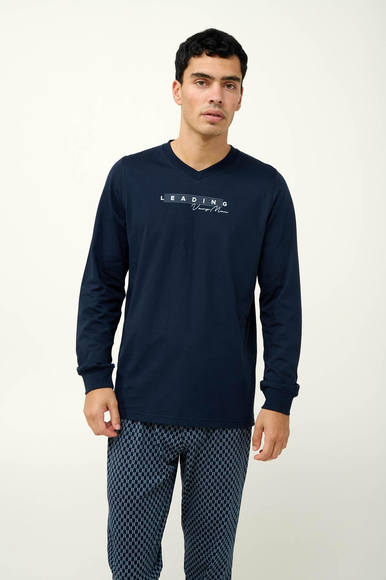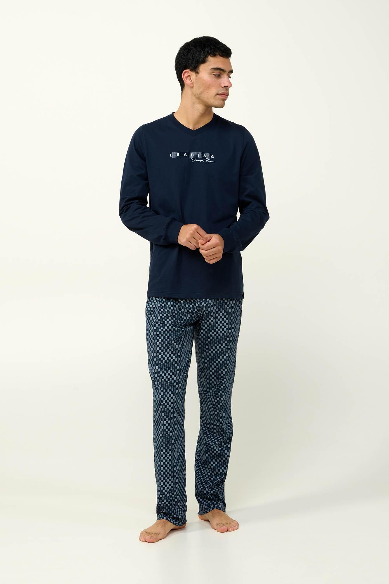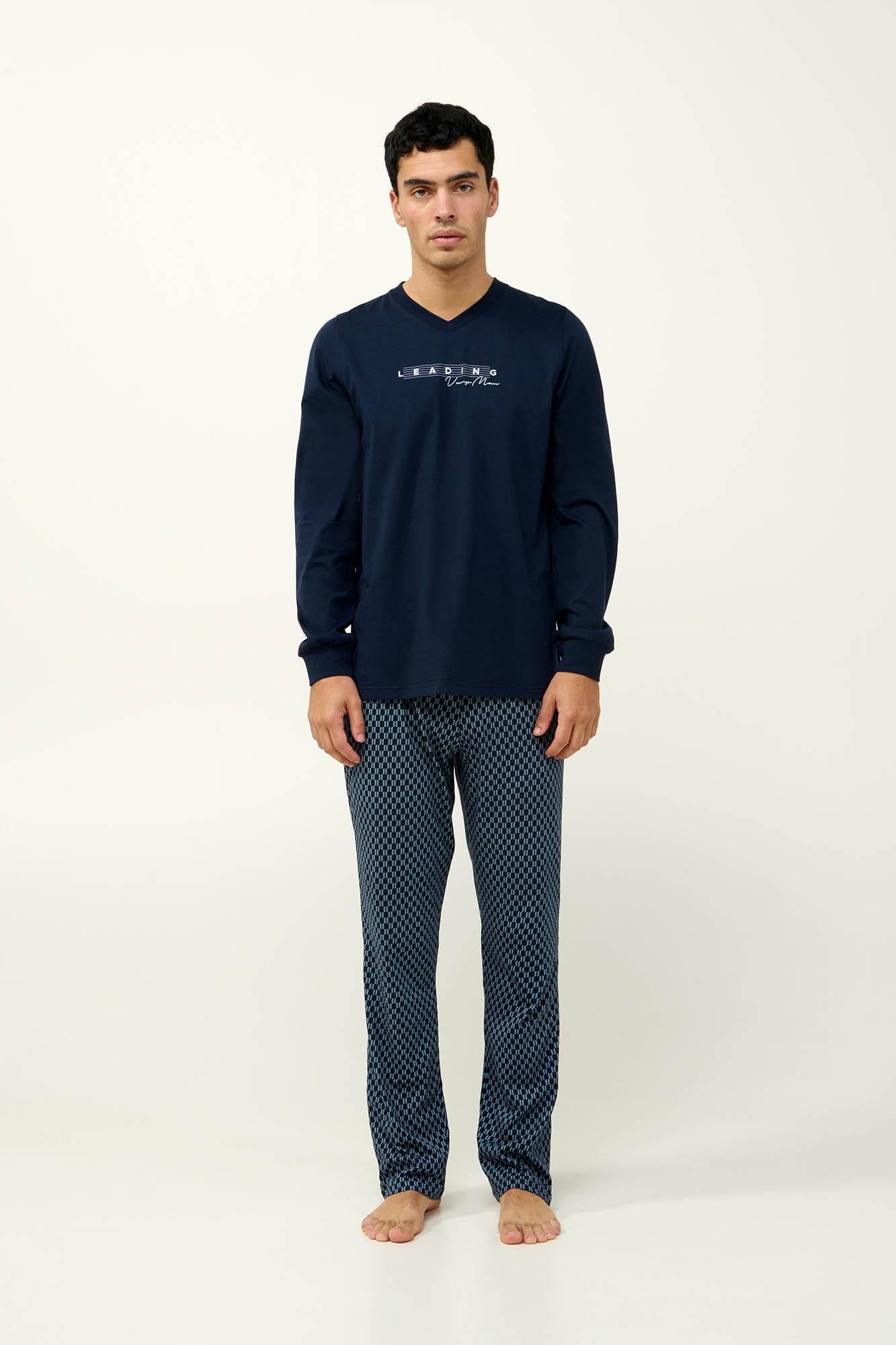 Υποδεχτείτε τον χειμώνα με αυτές τις ανδρικές πυτζάμες από 100% απαλό και διαπνέον βαμβάκι s. jersey. Το μονόχρωμο τοπ με V λαιμόκοψη και μανσέτες συνδυάζεται αρμονικά με μακρύ παντελόνι σε κλασικό γεωμετρικό μοτίβο. Ένα σετ που θα σας βοηθήσει να χαλαρώσετε μετά από μια μεγάλη ημέρα η να απολαύσετε ένα ήρεμο πρωινό.