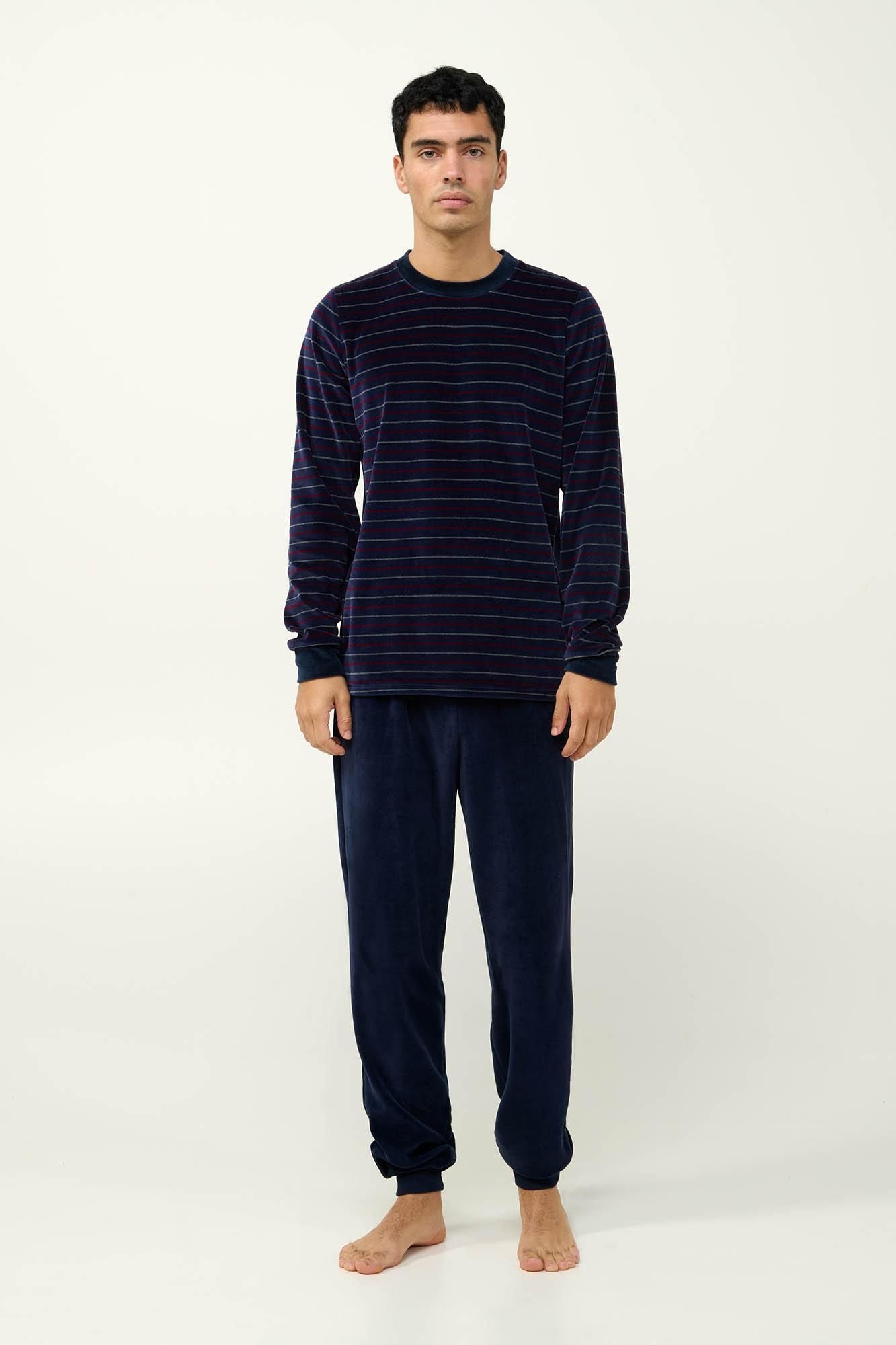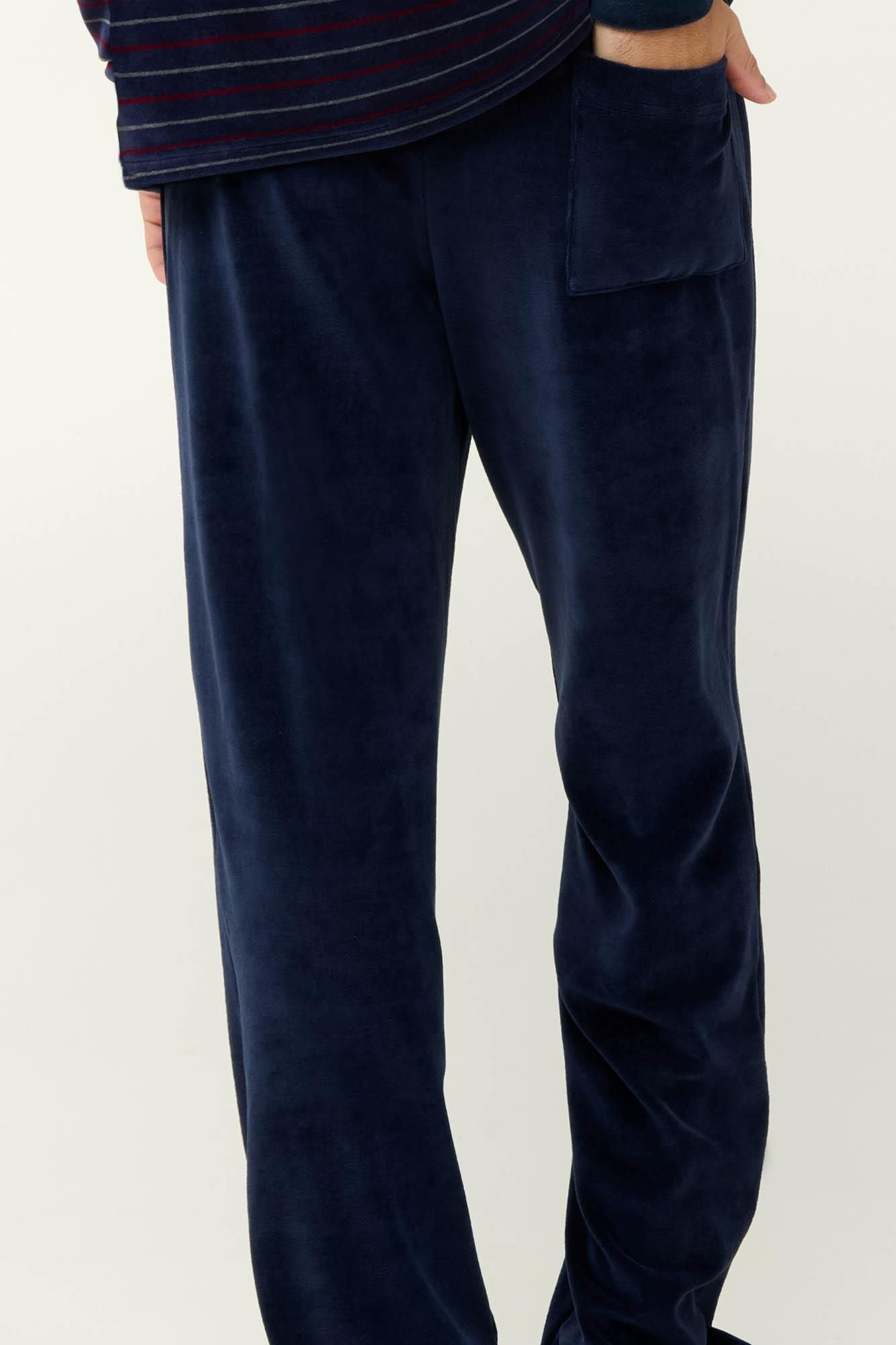 Προσθέστε στην γκαρνταρόμπα σας ένα σετ ανδρικές πυτζάμες που αποτελείτε από μονόχρωμο παντελόνι με μανσέτες και ριγέ μπλούζα με λαιμόκοψη V και μανσέτες στα μανίκια. Κατασκευασμένο από πλούσιο σε βαμβάκι βελούδο θα σας κρατήσει ζεστούς προσφέροντας απαλή αίσθηση στο σώμα. Ένας όμορφος συνδυασμός κομψότητας και άνεσης που θα εκτιμήσετε τους πιο κρύους μήνες.