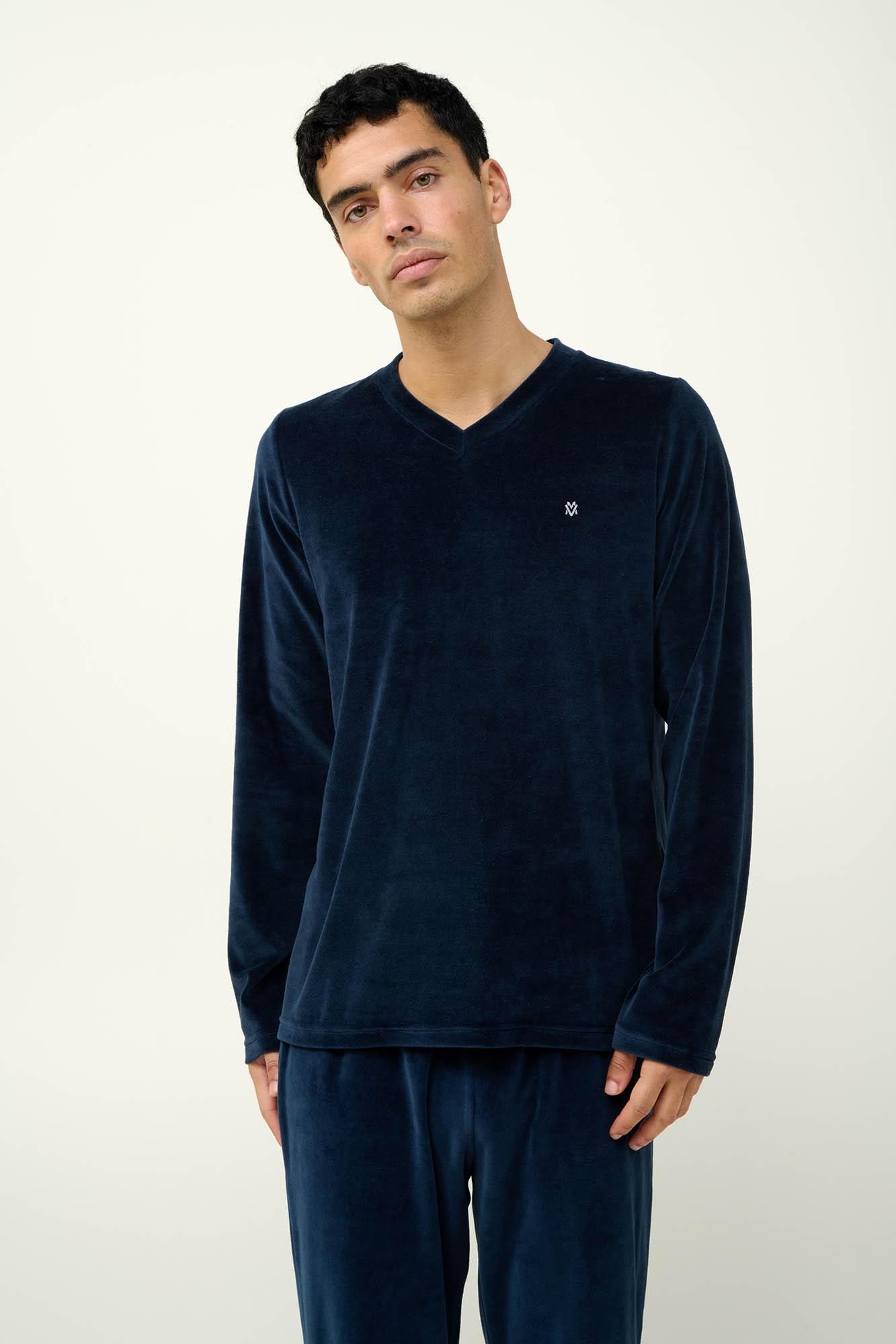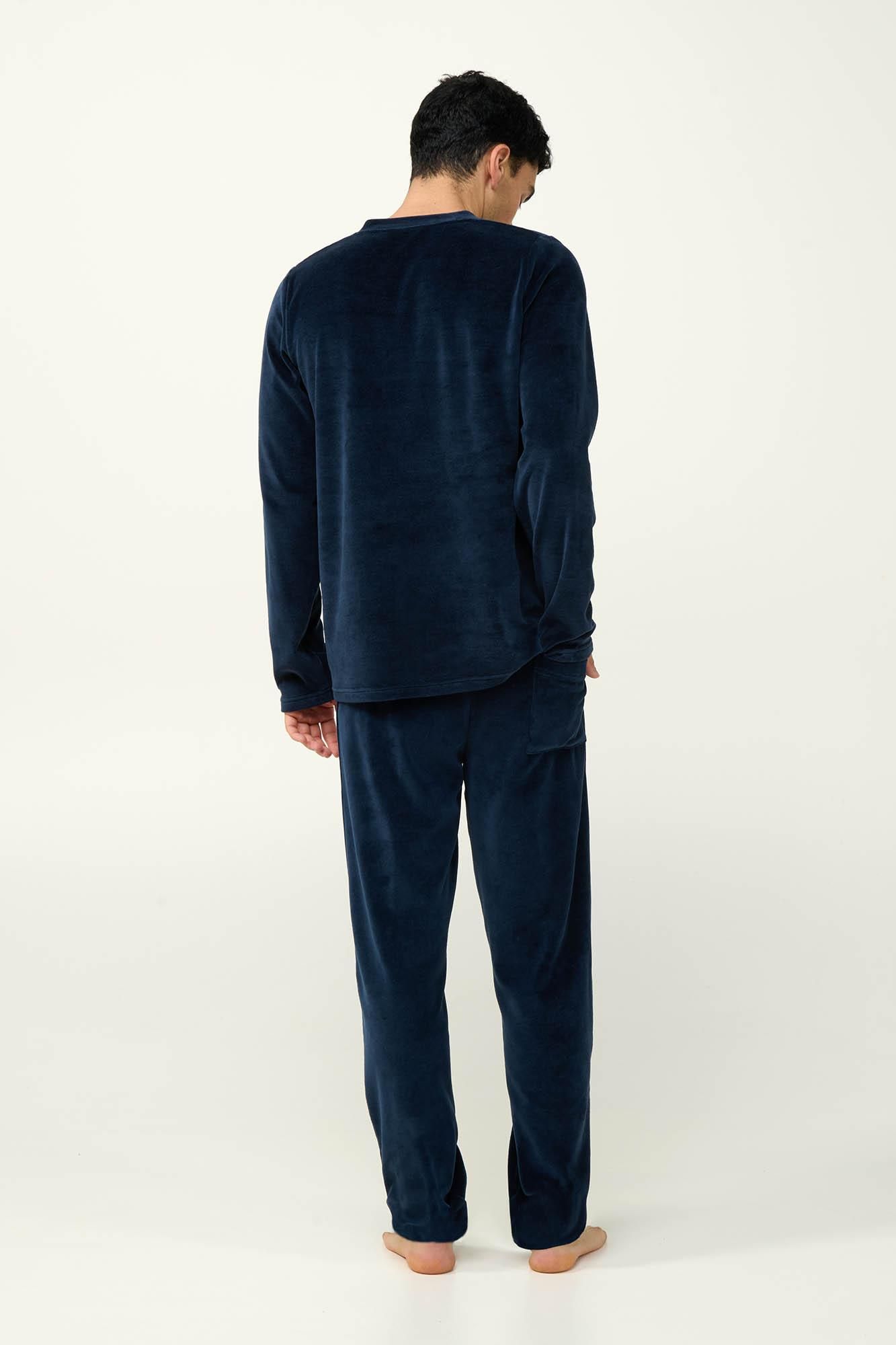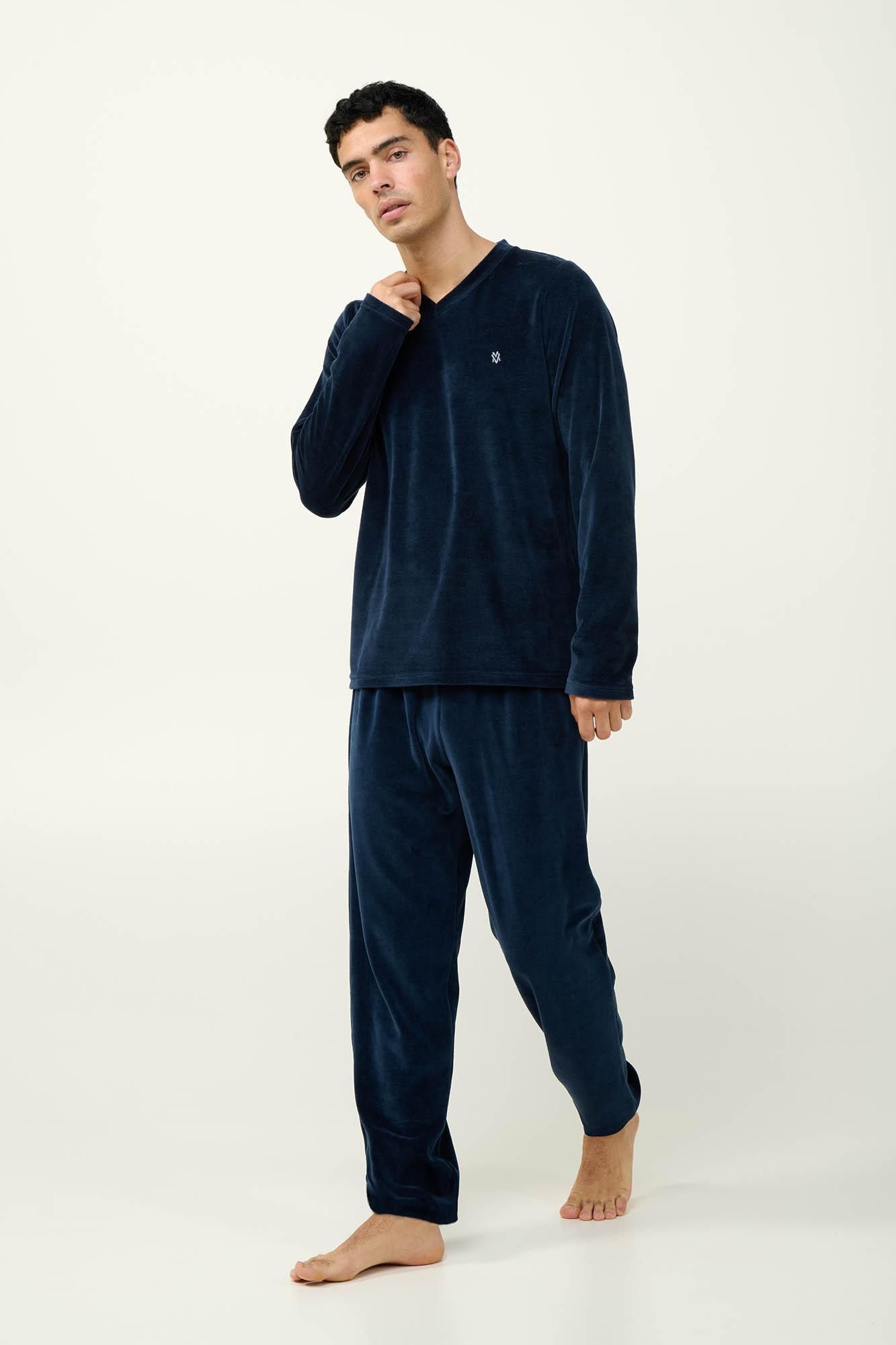 Επιλέξτε ένα σετ ανδρικές πυτζάμες που αποτελείτε από μονόχρωμο παντελόνι με τσέπη στο πίσω μέρος και μονόχρωμη μπλούζα με λαιμόκοψη V. Κατασκευασμένο από πλούσιο σε βαμβάκι βελούδο θα σας κρατήσει ζεστούς προσφέροντας απαλή αίσθηση στο σώμα. Ένα σετ που θα σας βοηθήσει να απολαύσετε τις στιγμές χαλάρωσης σας έπειτα από μια μεγάλη ημέρα.