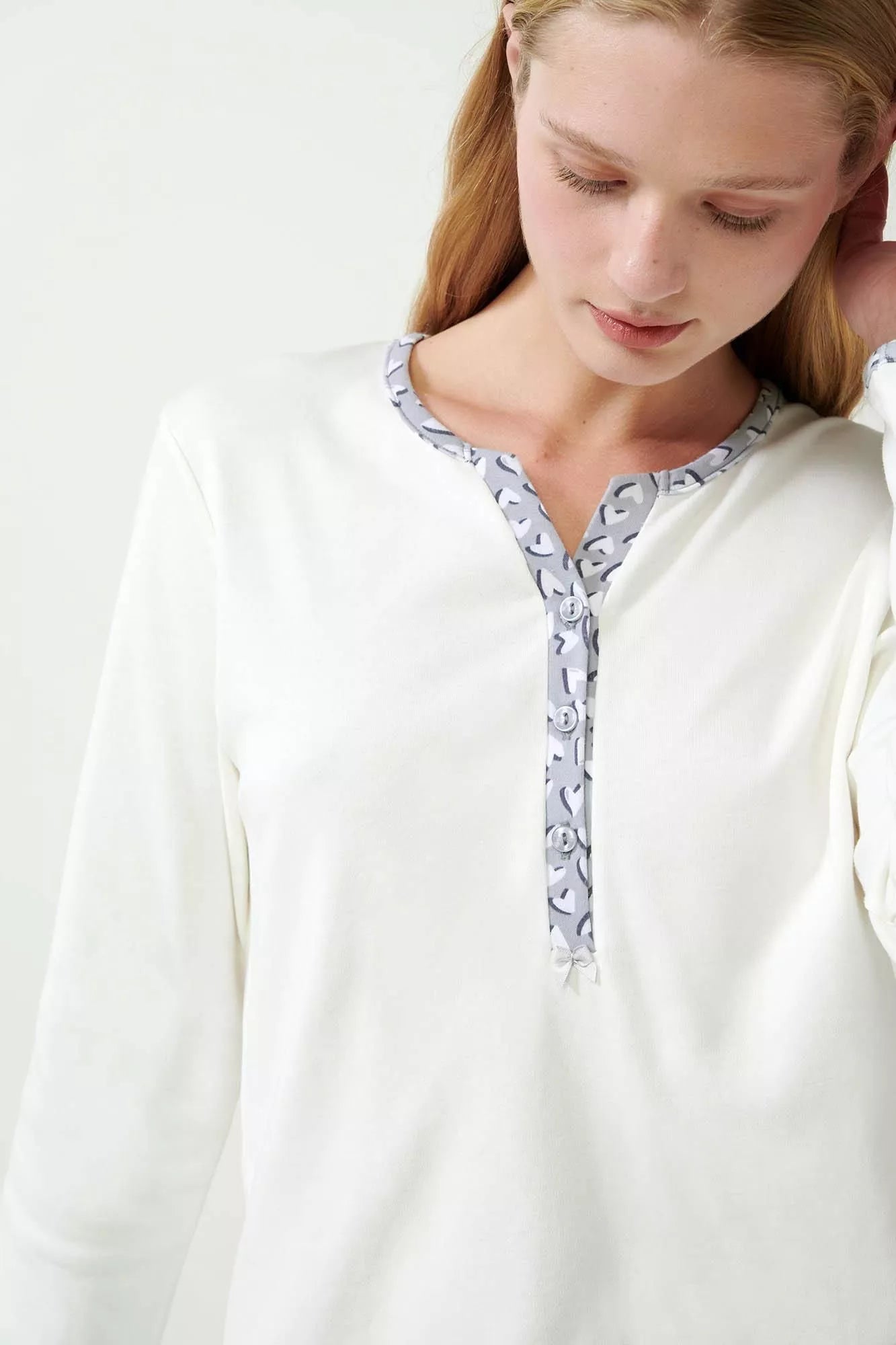 Ανακαλύψτε την άνεση και την πρακτικότητα που μπορεί να σας προσφέρει ένα σετ γυναικείες πυτζάμες εγκυμοσύνης. Το σετ αποτελείτε από ένα κρεμ τοπ με πρακτική πατιλέτα που επιτρέπει την εύκολη πρόσβαση στο στήθος για άνετο θηλασμό και γκρι παντελόνι γεμάτο καρδιές. Κατασκευασμένο από 100% βαμβάκι interlock που επιτρέπει στο σώμα να αναπνέει αυτό το σετ είναι σχεδιασμένο για να δώσει άνεση σε νέες και μέλλουσες μητέρες.