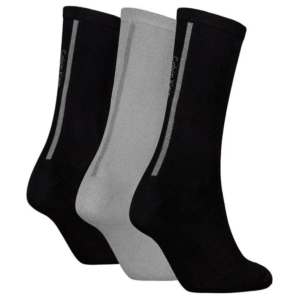 Σετ με τρία ζευγάρια γυναικείες κάλτσες από την καινούρια συλλογή της Calvin Klein. Το σετ αυτό διαθέτει τρία ζευγάρια κάλτσες, δύο σε μαύρη απόχρωση και ένα σε γκρι. Στο πίσω μέρος έχουν lurex ρίγα και λεπτομέρεια με το λογότυπο της εταιρείας. Το ύφασμα τους είναι βαμβακερό και έχει ελαστικότητα. Έρχεται σε κουτάκι που είναι ιδανικό για δώρο.