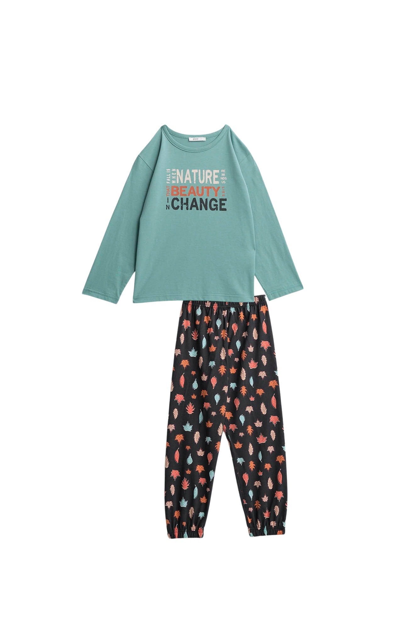 Παιδική πυτζάμα εμπριμέ, με μακρύ παντελόνι και μπλούζα με τύπωμα. Ένα σχέδιο από ελαφρύ βαμβάκι με ευχάριστη, νεανική διάθεση.