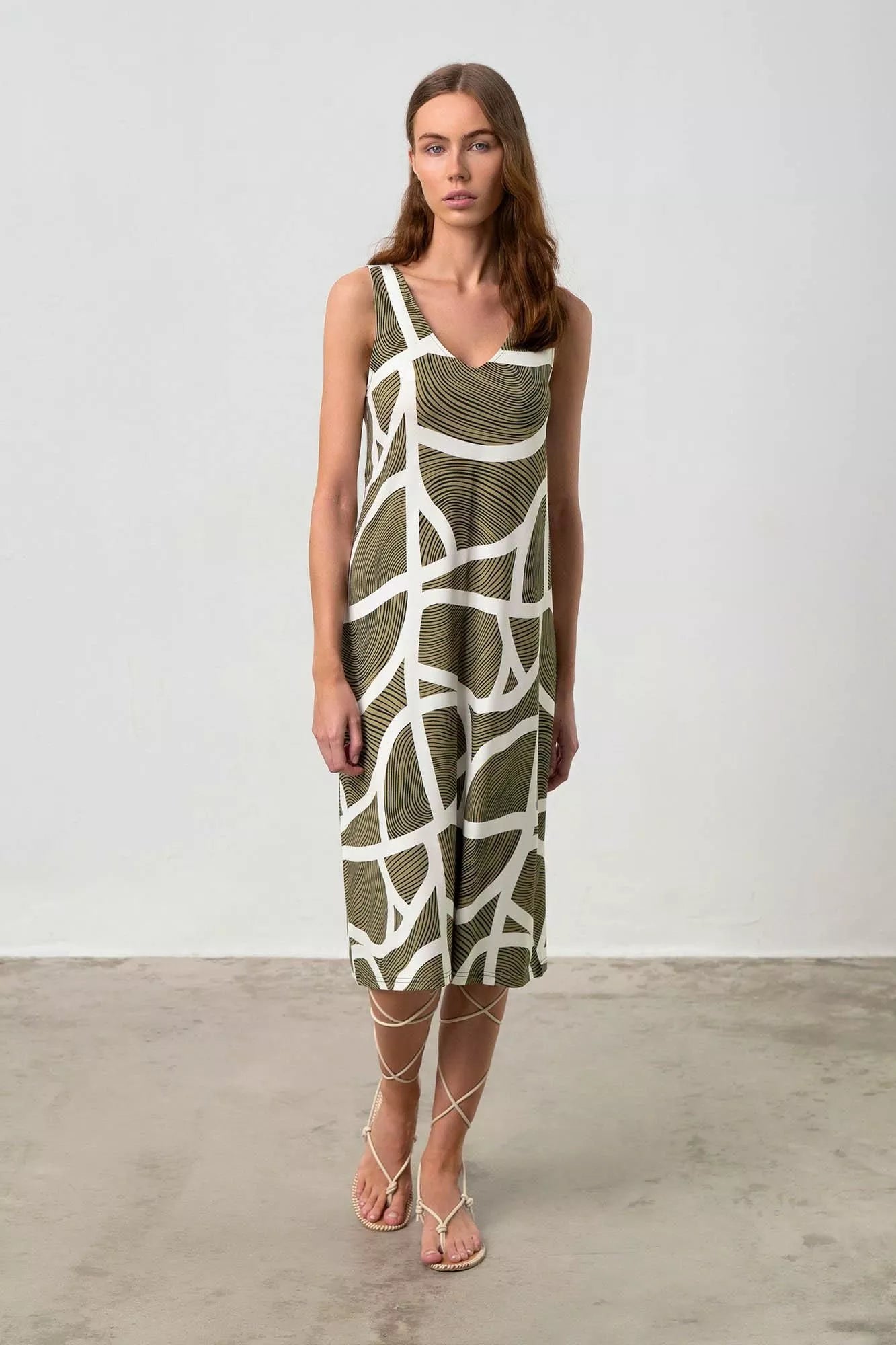 S. Jersey 95% Viscose + 5% Elastane Μήκος: 110cm. Το μοντέλο φοράει Small και έχει ύψος 175cm. Εμπριμέ, αμάνικο φόρεμα, με V λαιμόκοψη σε χαλαρή...