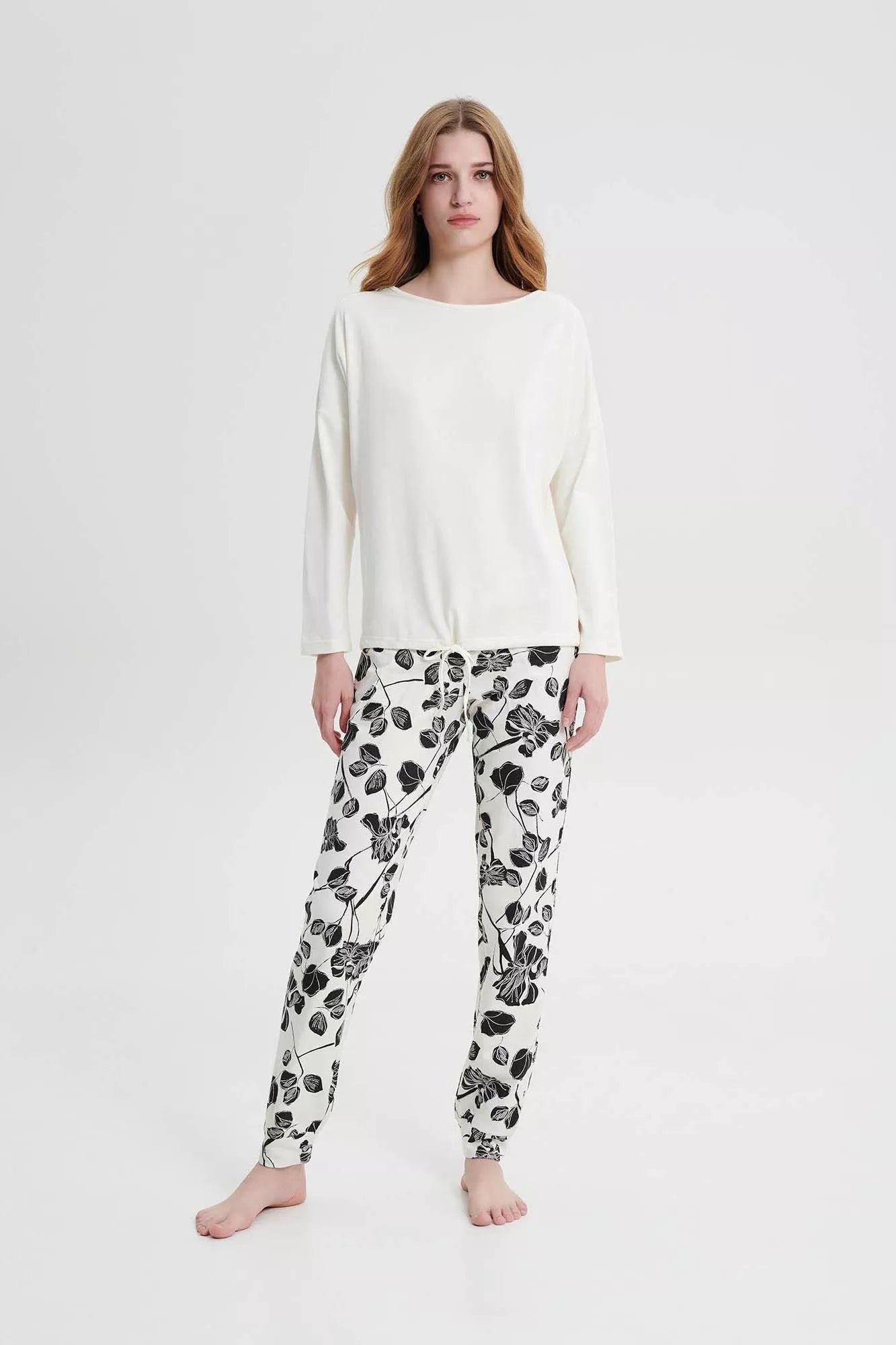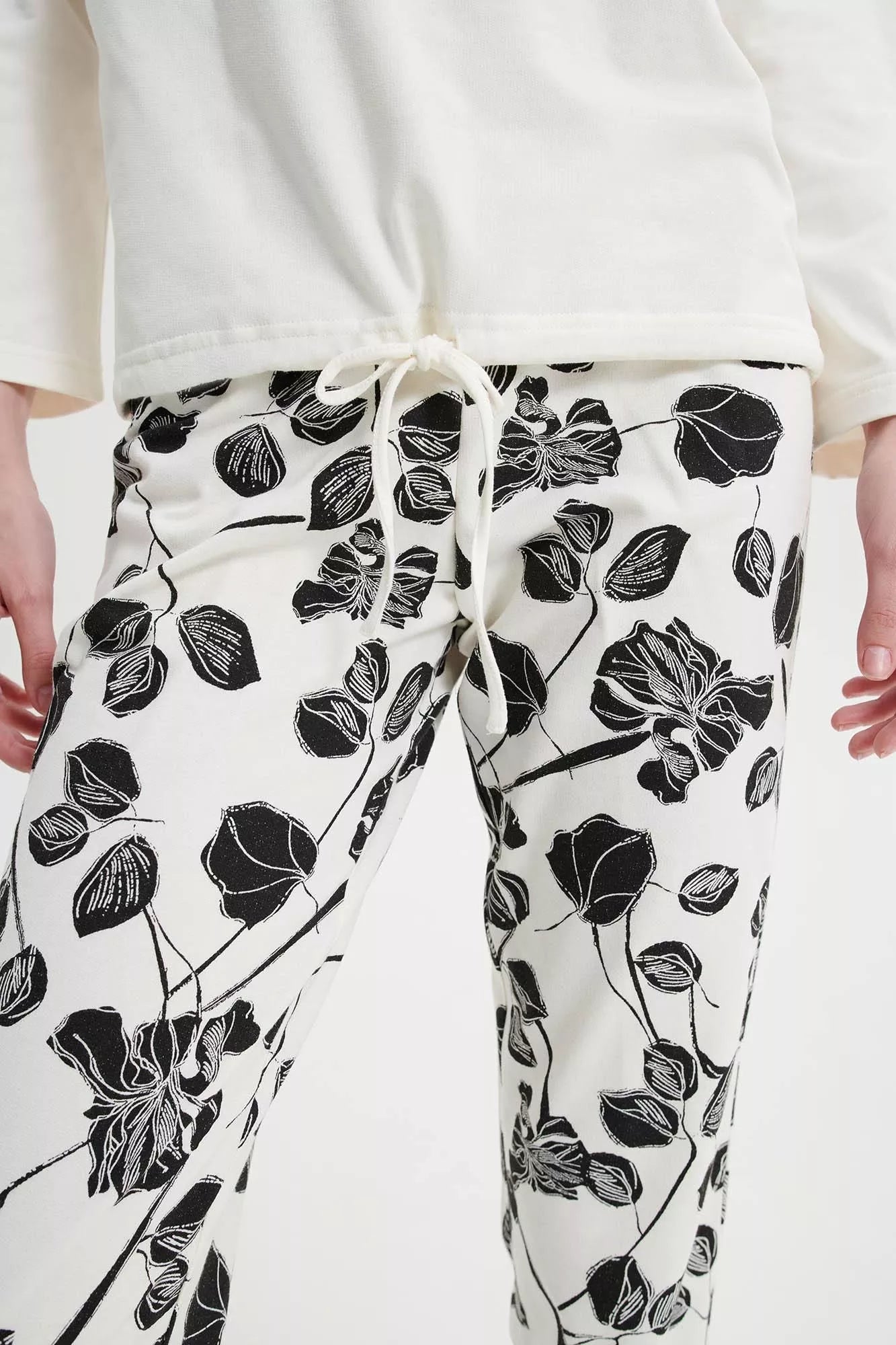 Γυναικεία πυτζάμα με φαρδιά λαιμόκοψη και εμπριμέ παντελόνι. Ένα όμορφο φλοράλ σε λευκό φόντο φτιαγμένο από ζεστό βαμβάκι για τις κρύες ημέρες του χειμώνα.