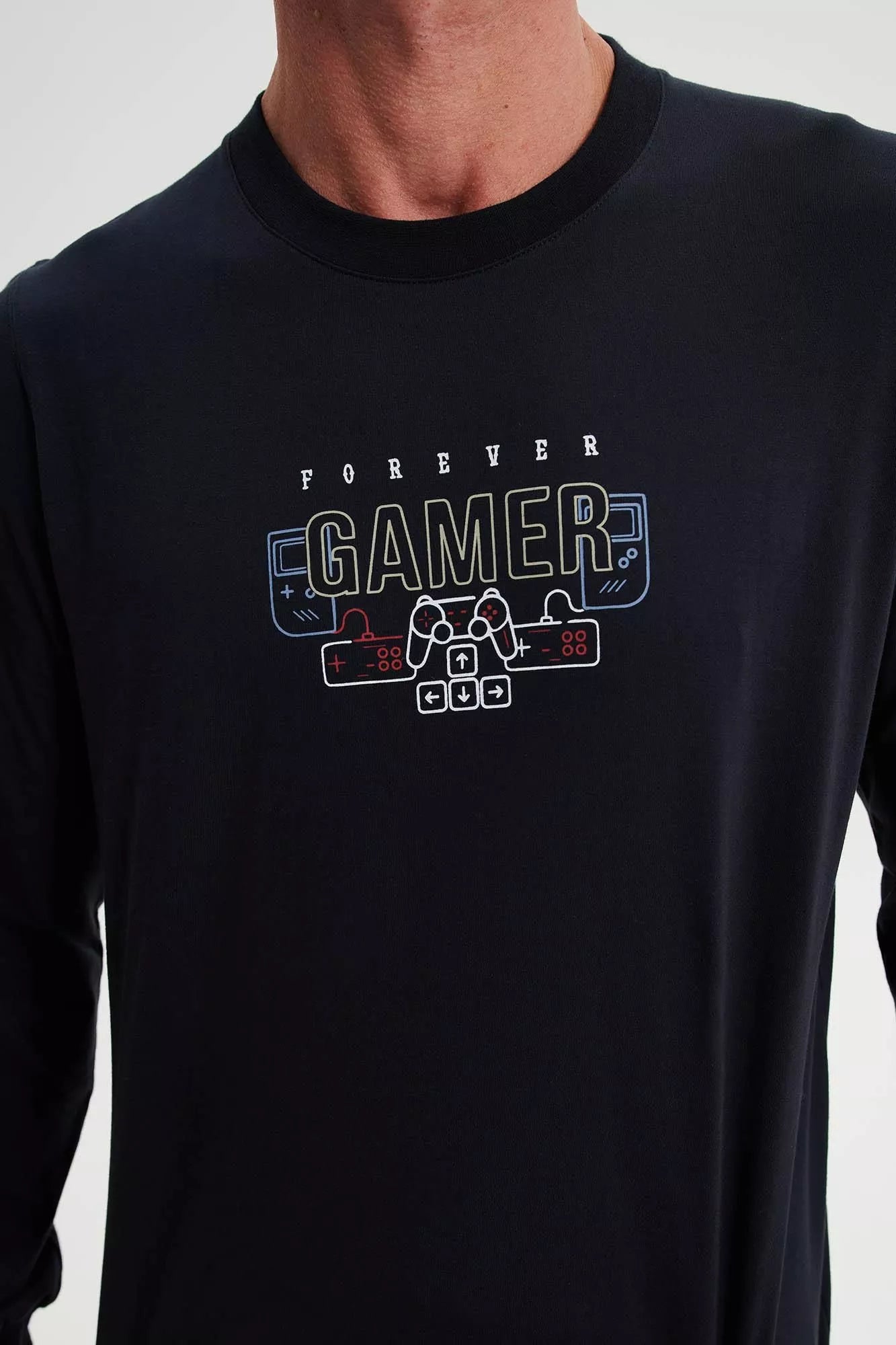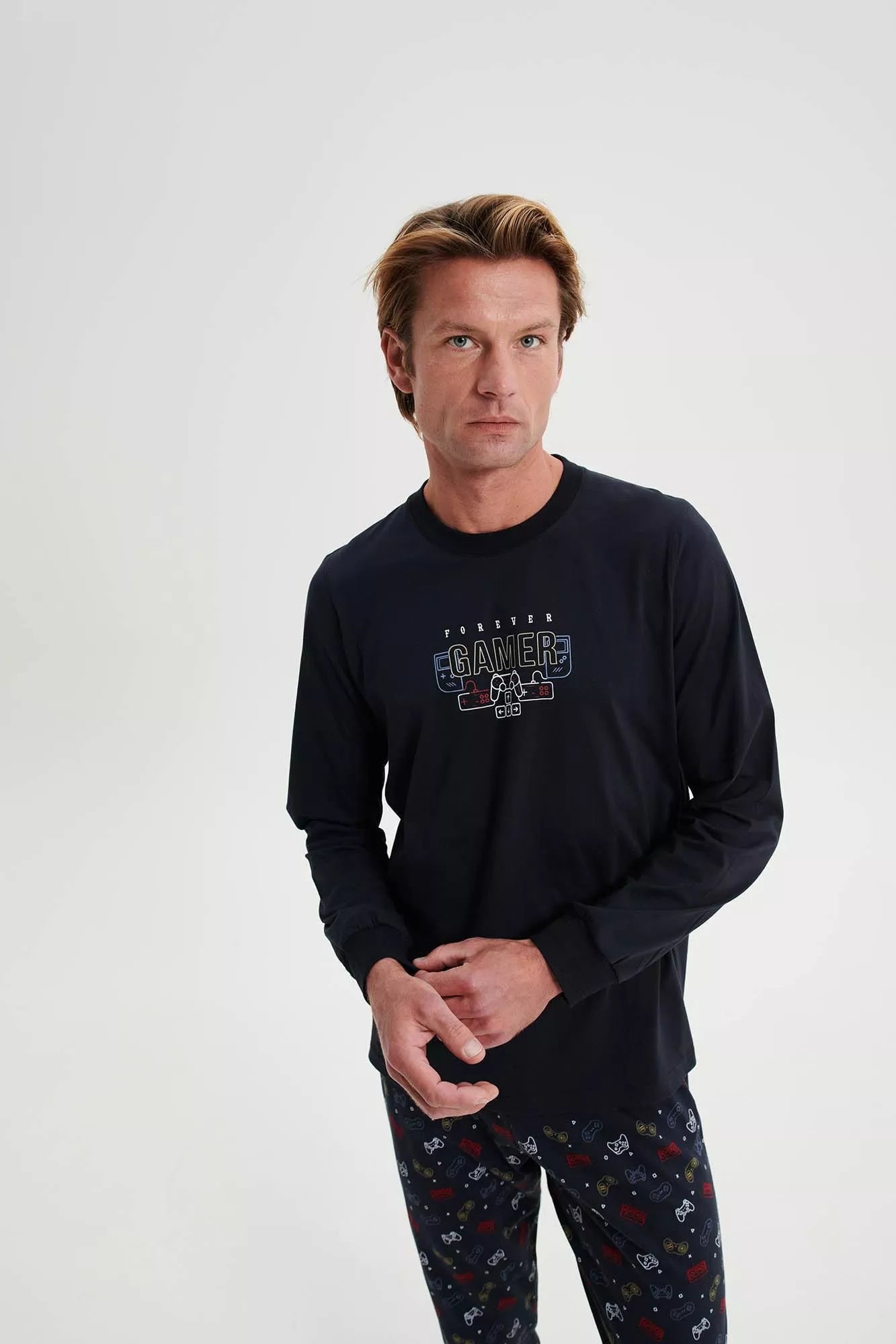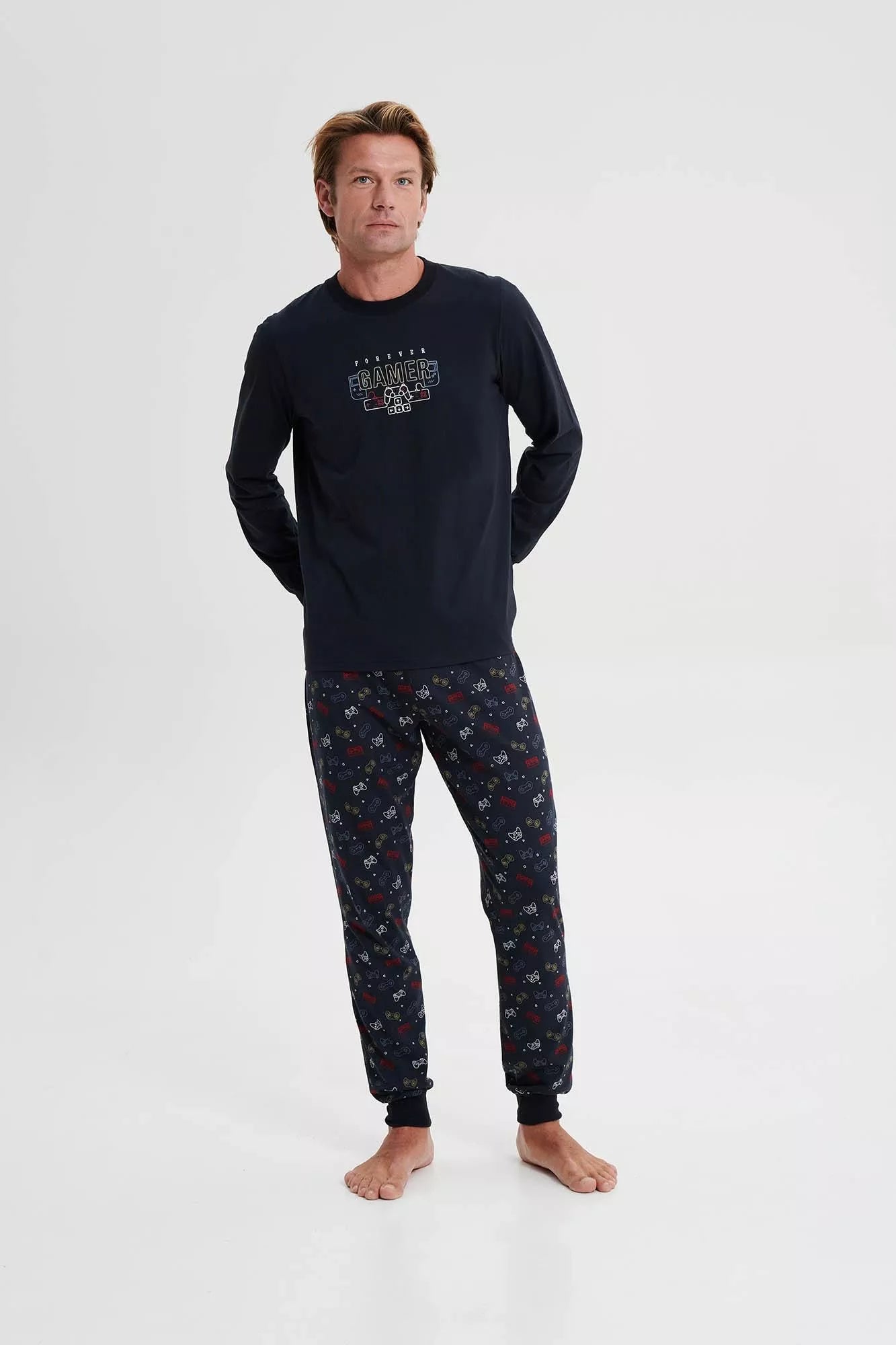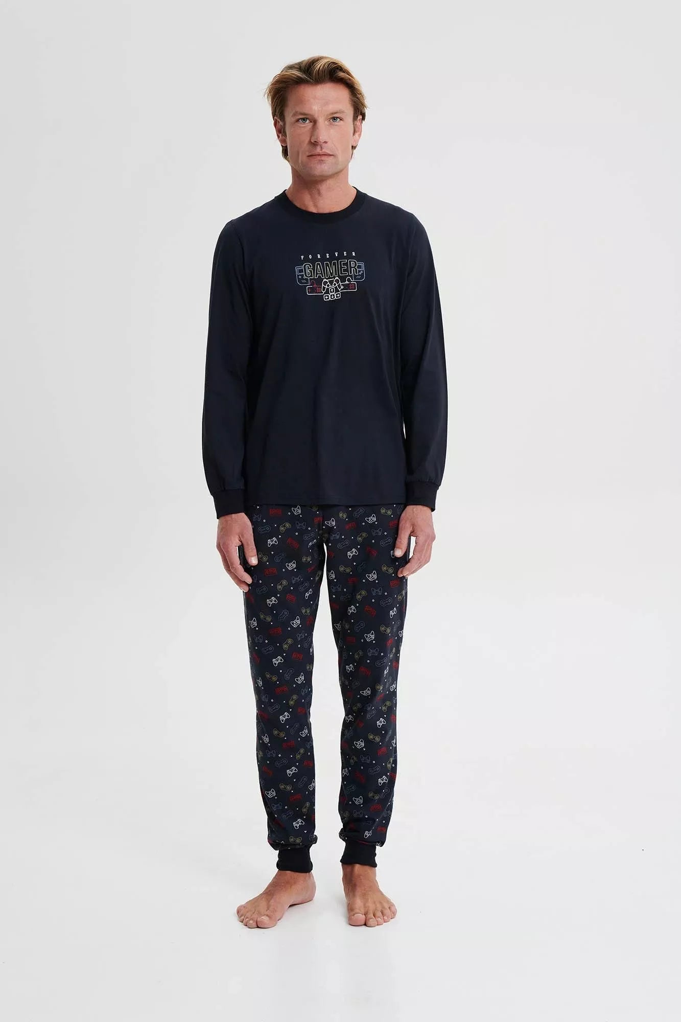 Ανδρική πυτζάμα με στρογγυλή λαιμόκοψη και λάστιχο στο μανίκι και το παντελόνι. Φτιαγμένη από βαμβάκι, με διάθεση για παιχνίδι όλη την ημέρα.