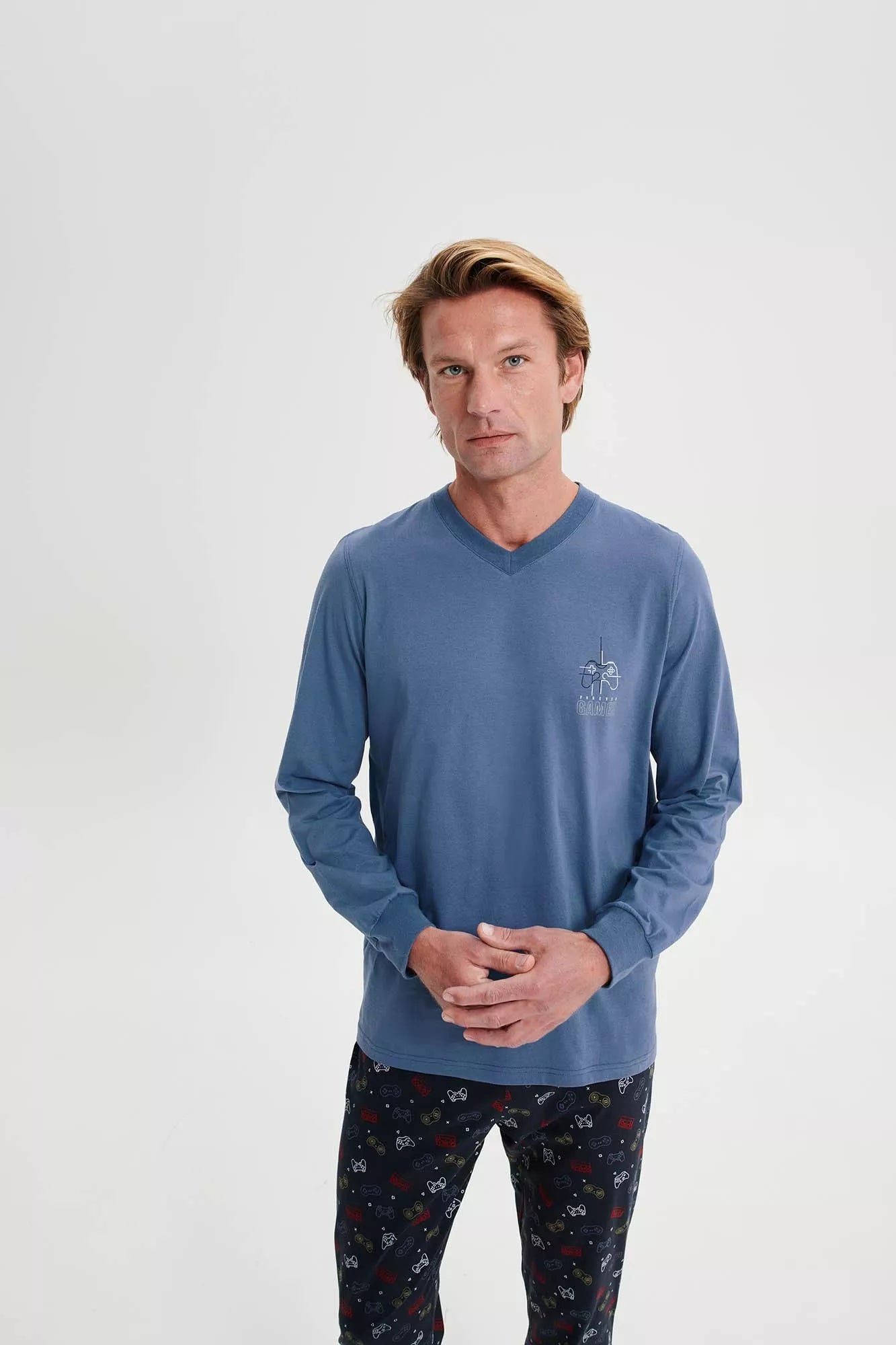 Ανδρική πυτζάμα με V λαιμόκοψη, λάστιχο στο μανίκι και εμπριμέ παντελόνι. Φτιαγμένη από βαμβάκι, με διάθεση για παιχνίδι όλη την ημέρα.