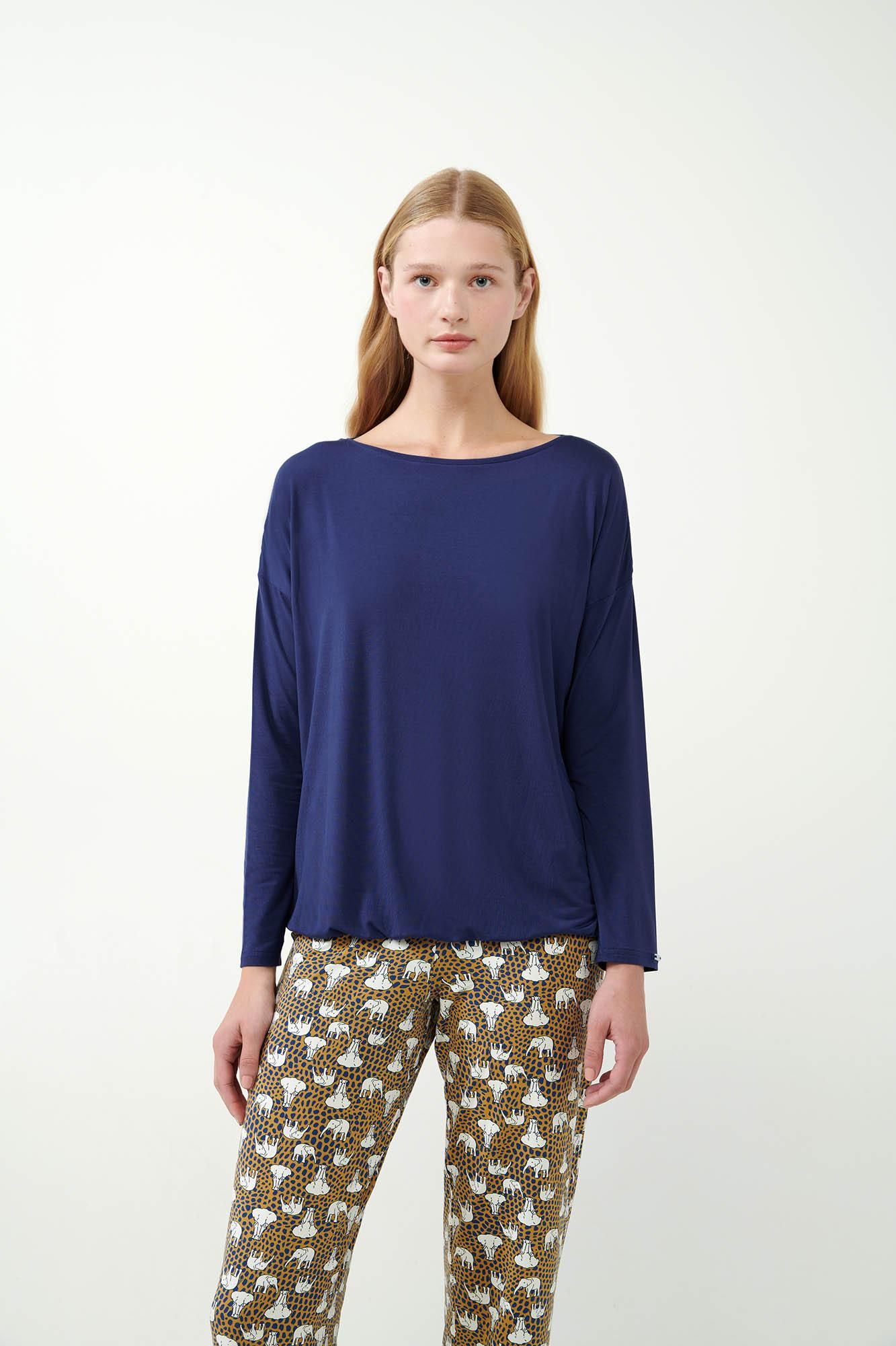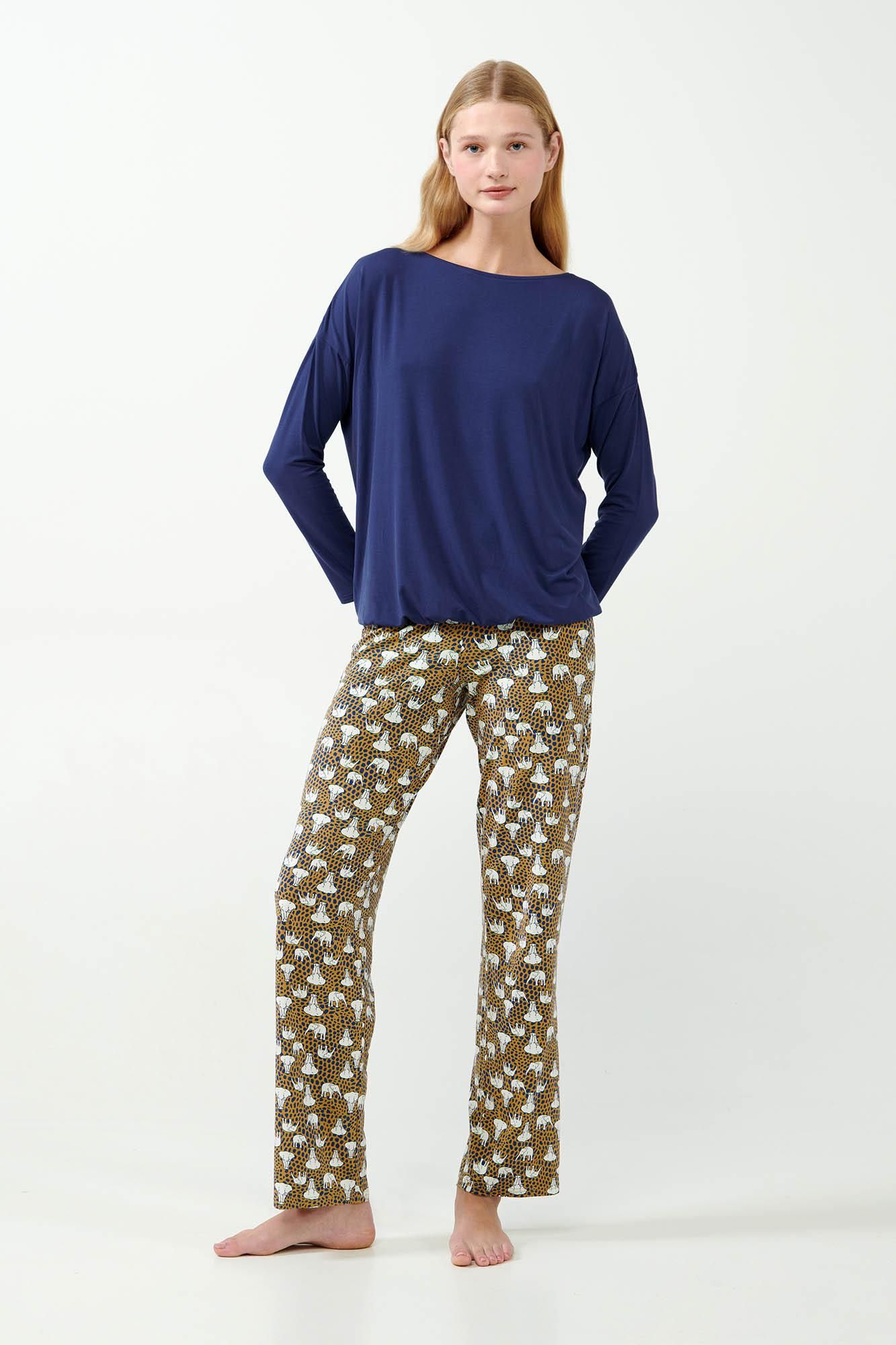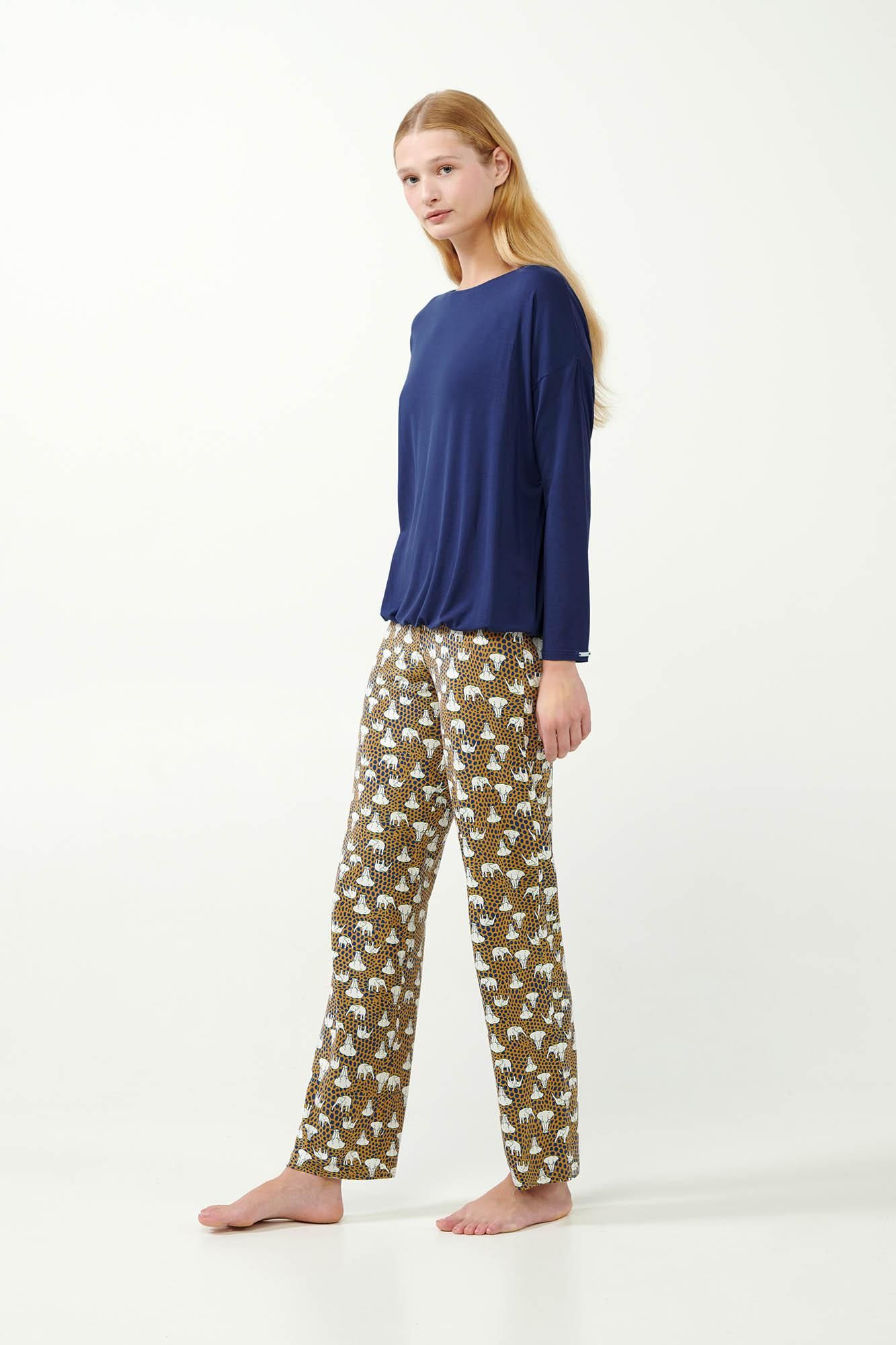 Ανακαλύψτε την απόλυτη άνεση με μια γυναικεία πυτζάμα από micromodal. Μοναδικά απαλό άγγιγμα, που αγκαλιάζει ευχάριστα το σώμα και επιτρέπει στο δέρμα να αναπνέει. Ένα σετ που αποτελείτε από μονόχρωμη μπλε μπλούζα με φαρδιά λαιμόκοψη και εμπριμέ παντελόνισε βαθιά απόχρωση ώχρας, διακοσμημένο με χαριτωμένα ελεφαντάκια. Φτιαγμένη σε χαλαρή γραμμή που επιτρέπει την ελευθερία κινήσεων. Συνδυάστε στυλ και άνεση για μοναδικές στιγμές χαλάρωσης στο σπίτι.
