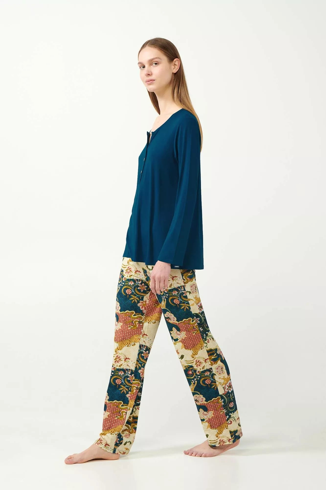 Αναβαθμίστε τη συλλογή σας με ένα όμορφο σετ γυναικείες πυτζάμες. Το σετ αποτελείται από μονόχρωμη μπλούζα σε βαθύ πράσινο κυπαρισσί χρώμα με φαρδιά λαιμόκοψη και παντελόνι με εκλεπτυσμένο patchwork μοτίβο. Κατασκευασμένο από απαλή viscose σε κανονική γραμμή, συνδυάζει κομψότητα και άνεση με ευκολία. Μια πρόταση για τις στιγμές χαλάρωσης σας ή έναν άνετο ύπνο.