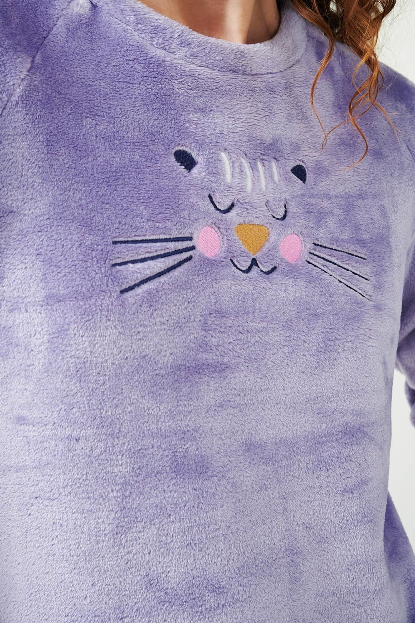 Απολαύστε το συνδυασμό ονειρικής γοητείας και άνεσης που προσφέρει αυτό το σετ γυναικείες πυτζάμες σε απόχρωση λεβάντας. Κατασκευασμένες από μαλακό fleece με ζεστή και απαλή σα βελούδο αίσθηση στο δέρμα. Μπλούζα με διασκεδαστικό τύπωμα στο στήθος και μανσέτες στα μανίκια για βέλτιστη εφαρμογή. Μια όμορφη πρόταση για τη συλλογή σας, που θα σας κρατήσει ζεστή στο σπίτι ακόμα και τις πιο κρύες ημέρες.