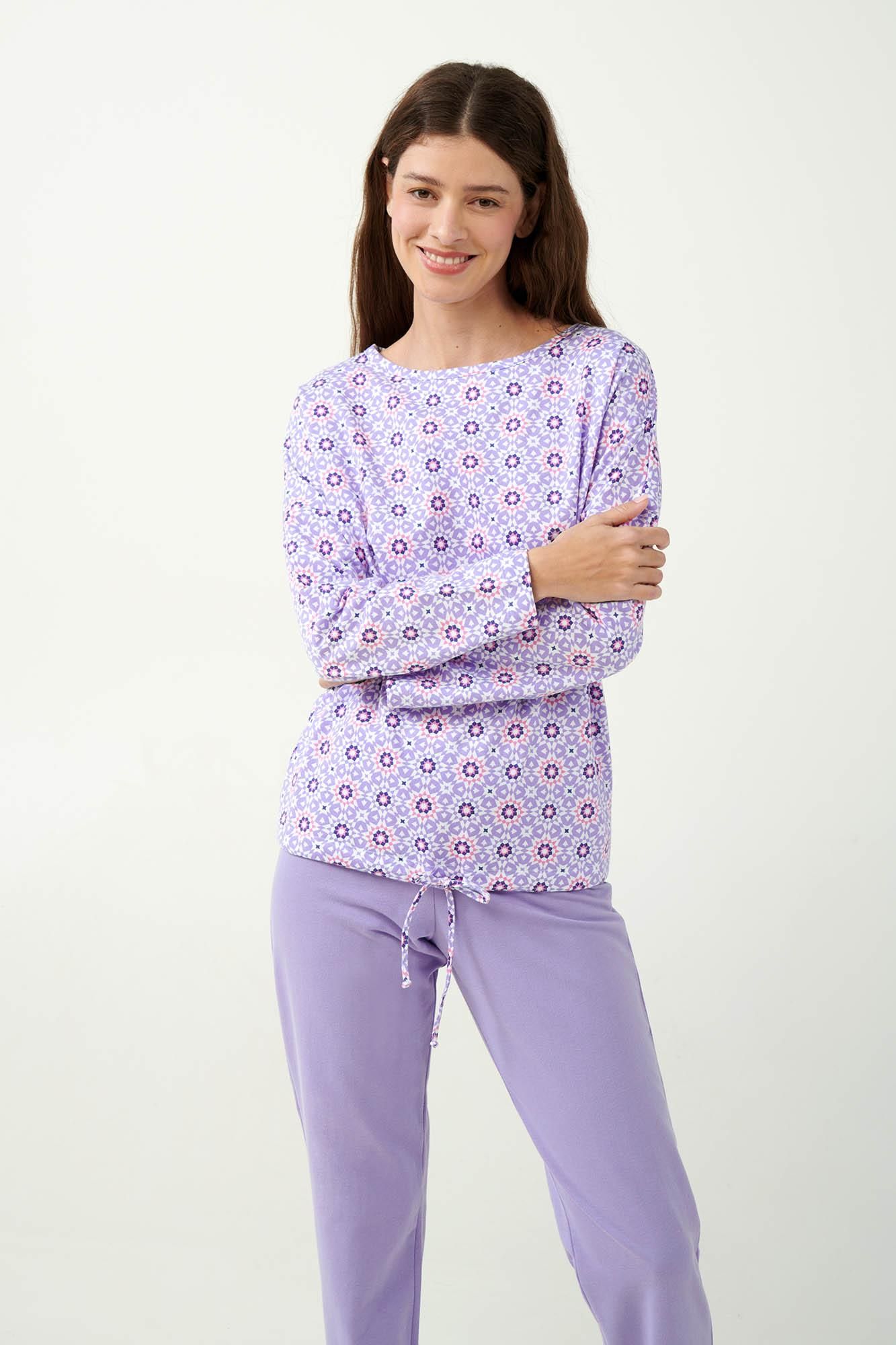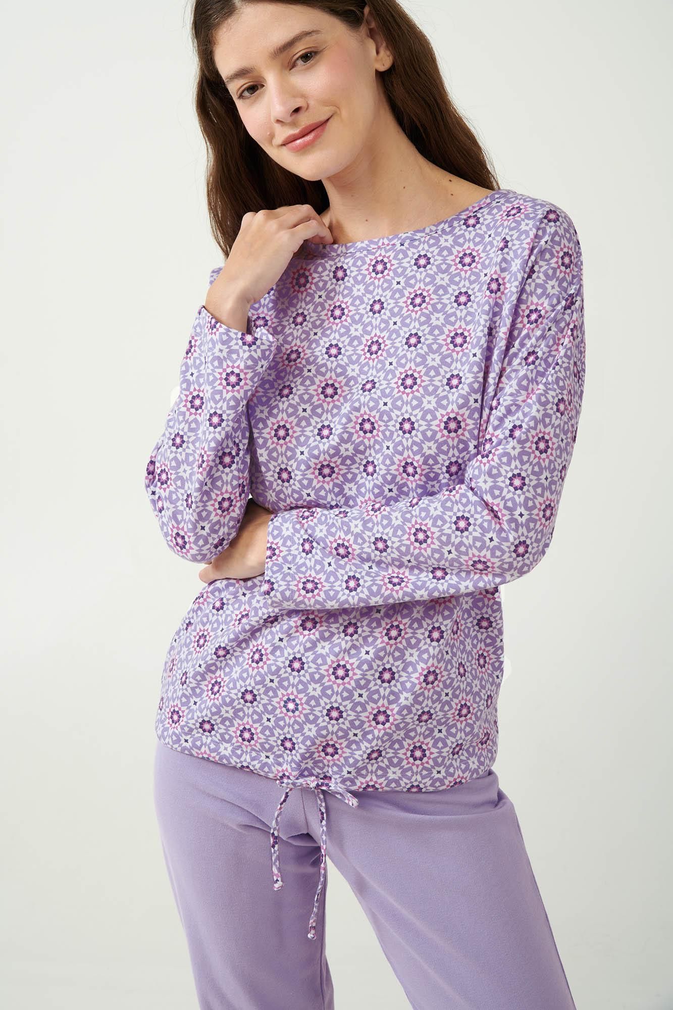 Αναβαθμίστε τη συλλογή σας με ένα γοητευτικό σετ γυναικείες πυτζάμες σε γαλήνιες λιλά αποχρώσεις. Το πάνω μέρος κοσμεί ένα μαγευτικό μοτίβο καλειδοσκόπιο ενώ το μονόχρωμο παντελόνι με μανσέτες συμπληρώνει αρμονικά το σύνολο. Κατασκευασμένο από 100% βαμβάκι φούτερ προσφέρει ζεστή αίσθηση και απαλότητα στο σώμα για να διασφαλίσει έναν άνετο ύπνο.