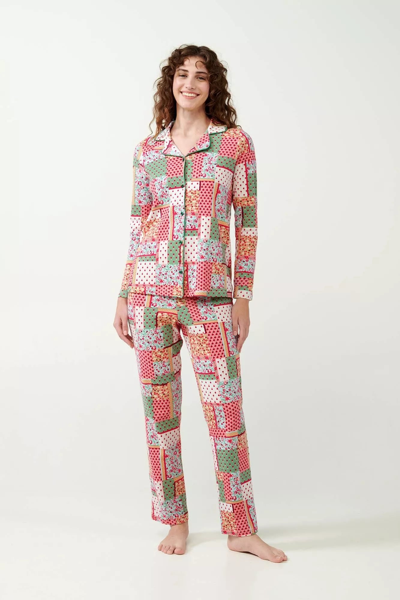 21372 820 VAMP ΓΥΝ. ΠΥΤΖΑΜΑ 100% ΒΑΜΒΑΚΙ χρώμα: GREEN BARLEY Κουμπωτή Πυτζάμα Interlock με Vintage Patchwork Μοτίβο