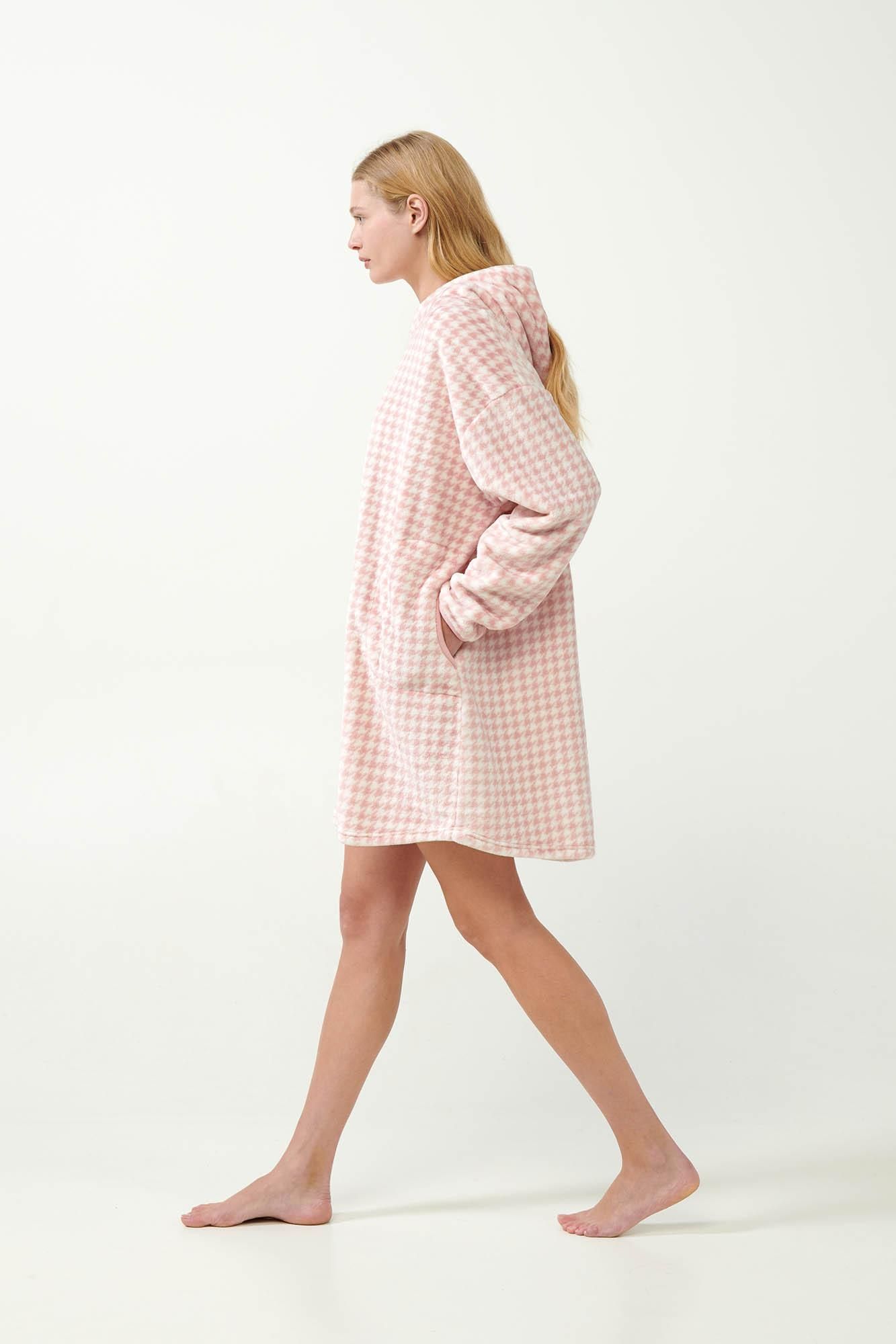 Προσθέστε στη συλλογή σας ένα υπέροχο νυχτικό σε ροζ απόχρωση και πιε-ντε-πουλ μοτίβο. Κατασκευασμένο από εξαιρετικά απαλό fleece που αφήνει μια ζεστή αίσθηση στο σώμα και σχεδιασμένο σε χαλαρή γραμμή με πρακτικές τσέπες για να κρατάτε κοντά σας προσωπικά αντικείμενα. Φορέστε τη κουκούλα σας και παραμείνετε ζεστή και χαλαρή απολαμβάνοντας ένα όμορφο βράδυ στο καναπέ ή ένα χαλαρό πρωινό.