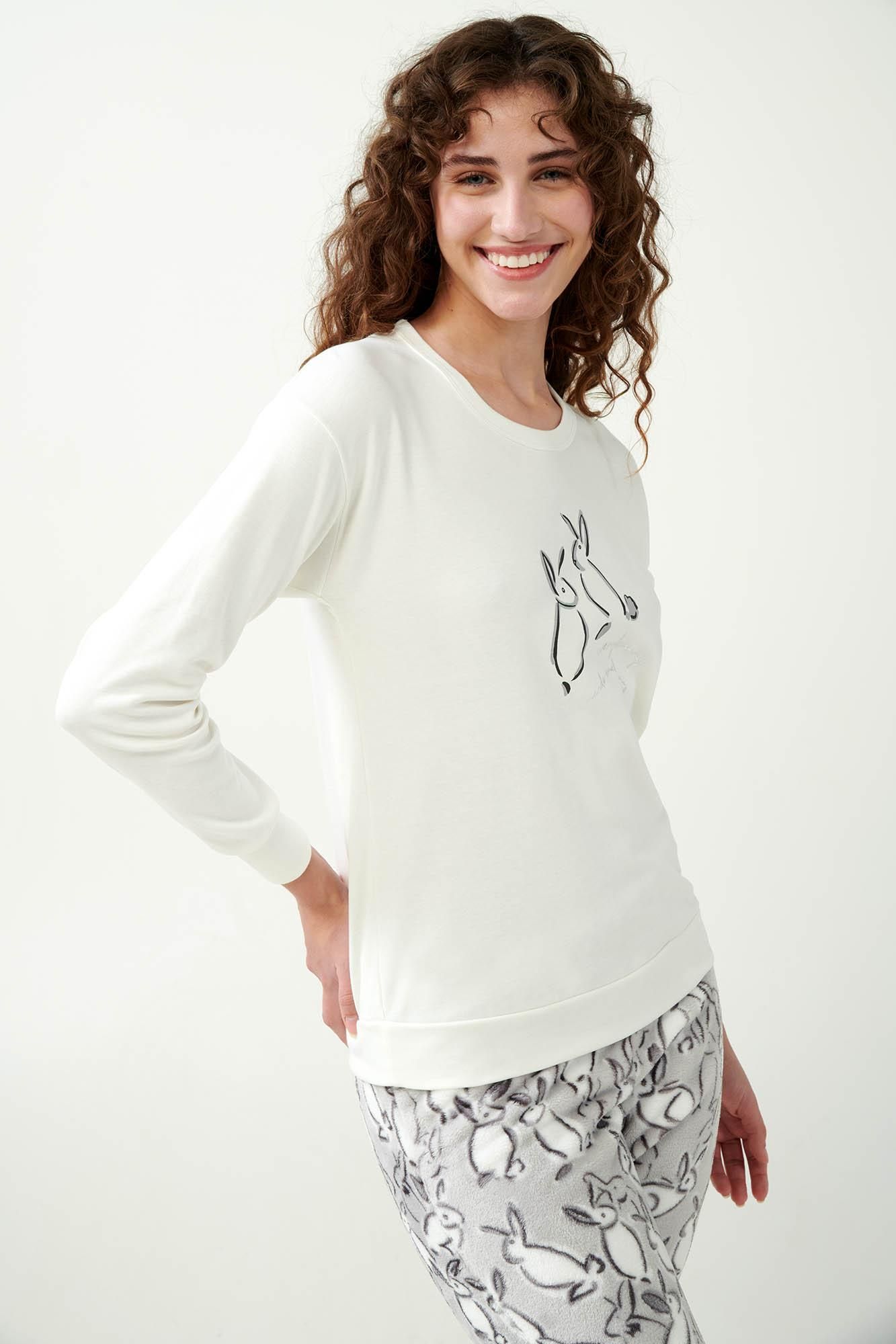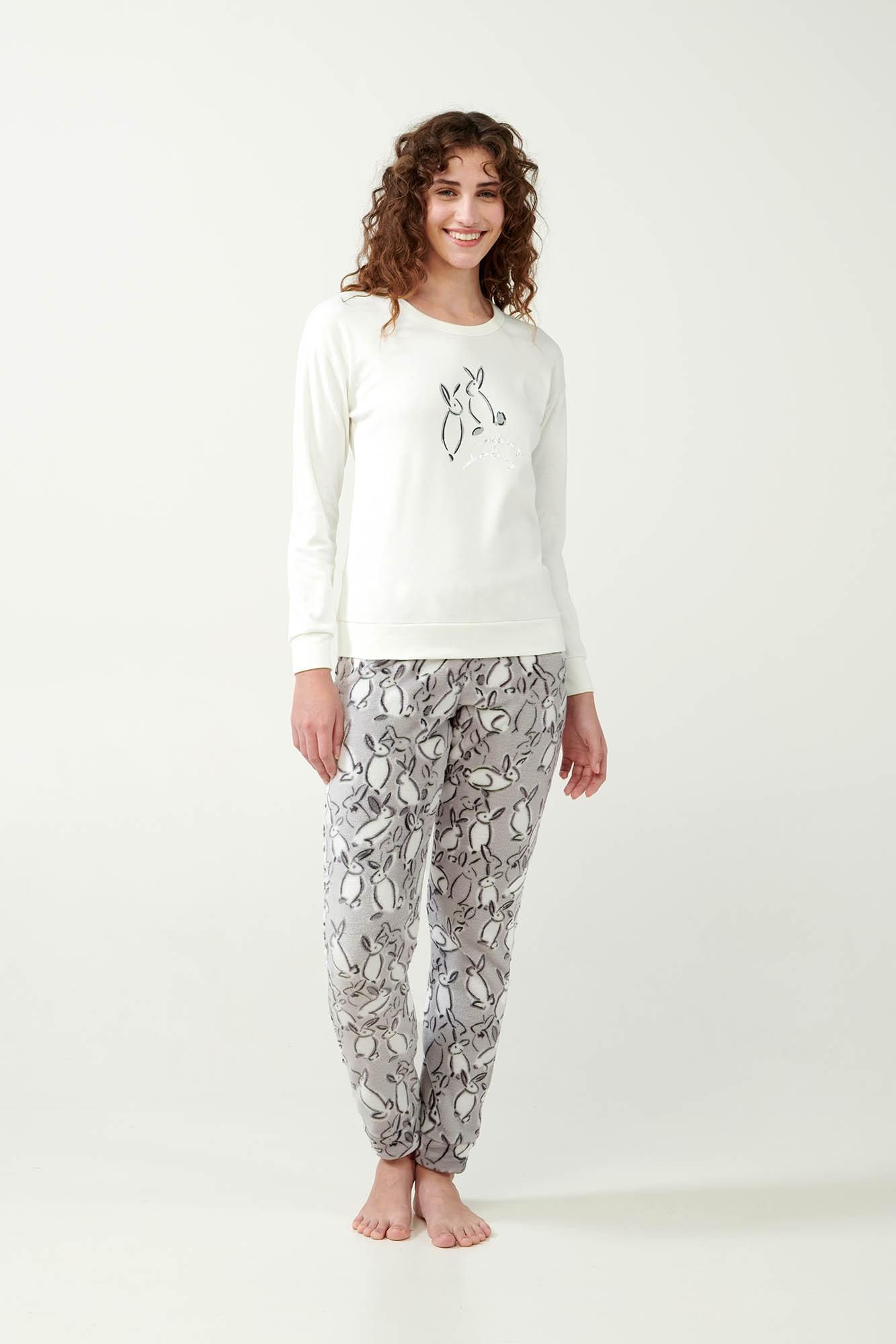 Αποκτήστε ένα όμορφο σετ γυναικείες πυτζάμες με χαριτωμένα λαγουδάκια. Αποτελείτε από κρεμ μπλούζα, φτιαγμένη από 100% βαμβάκι interlock με τύπωμα στο στήθος, μανσέτες και λάστιχο στη μέση για βέλτιστη εφαρμογή. Το σετ συμπληρώνει ένα ζεστό εμπριμέ παντελόνι με μανσέτες, κατασκευασμένο από απαλό fleece. Ένας ιδιαίτερος συνδυασμός υφών που θα σας δώσει την άνεση που χρειάζεστε στις στιγμές χαλάρωσης σας.