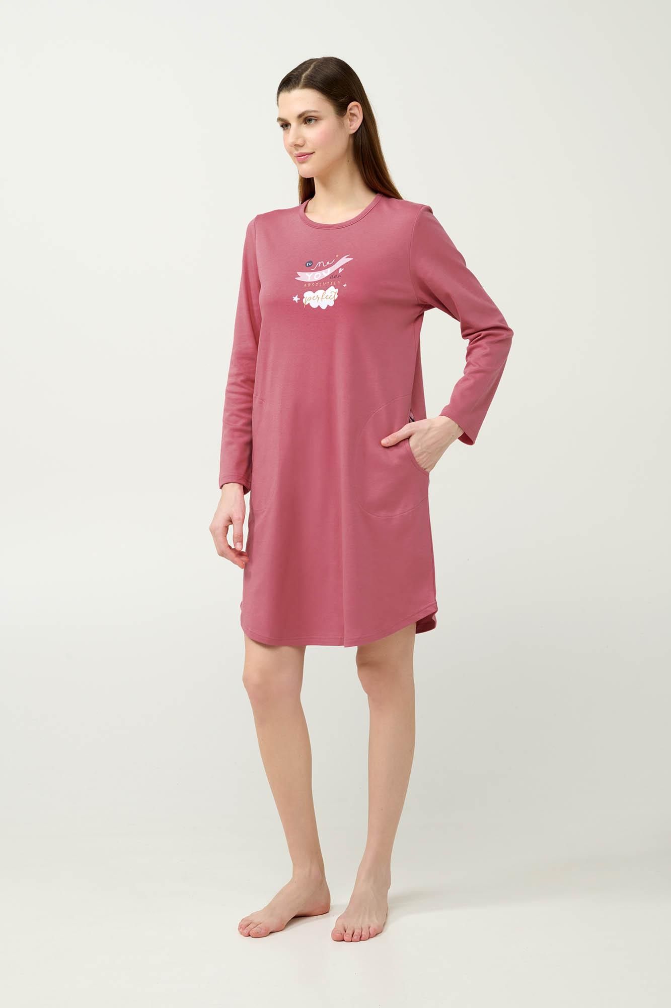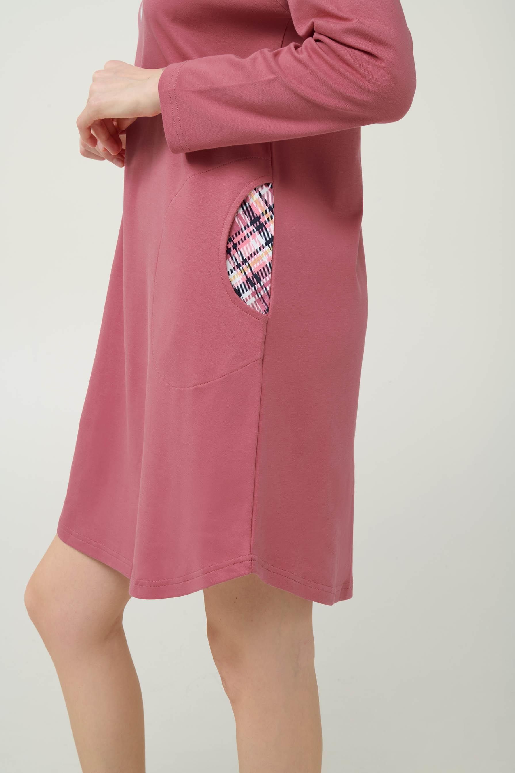 Απολαύστε καθημερινή άνεση με αυτό το νυχτικό, κατασκευασμένο από 100% βαμβάκι s. jersey. Σχεδιασμένο με μακριά μανίκια και πρακτικές τσέπες στο πλάι, επενδυμένες με ένα καρό ύφασμα σε ροζ αποχρώσεις. Ιδανικό για στιγμές χαλάρωσης ή έναν ήρεμο ύπνο, αυτό το νυχτικό συνδυάζει πρακτικότητα με απαλή και διαπνέουσα αίσθηση που θα αγαπήσετε.