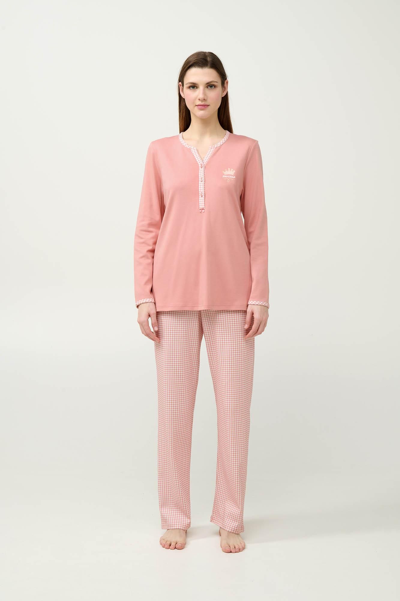 Ανανεώστε τη χειμερινή σας γκαρνταρόμπα με αυτό το σετ γυναικείες πυτζάμες, κατασκευασμένο από 100% απαλό βαμβάκι interlock για διαρκή άνεση και διαπνέουσα αίσθηση. Το επάνω μέρος διαθέτει κλασική πατιλέτα και μακριά μανίκια, ενώ το παντελόνι σε θηλυκό ροζ καρό μοτίβο προσθέτει μια ρομαντική πινελιά στο σύνολο. Σχεδιασμένο για να συνδυάζει στυλ και πρακτικότητα, αυτό το διαχρονικό σετ είναι ιδανικό για ξεκούραστα βράδια και ήρεμο ύπνο.