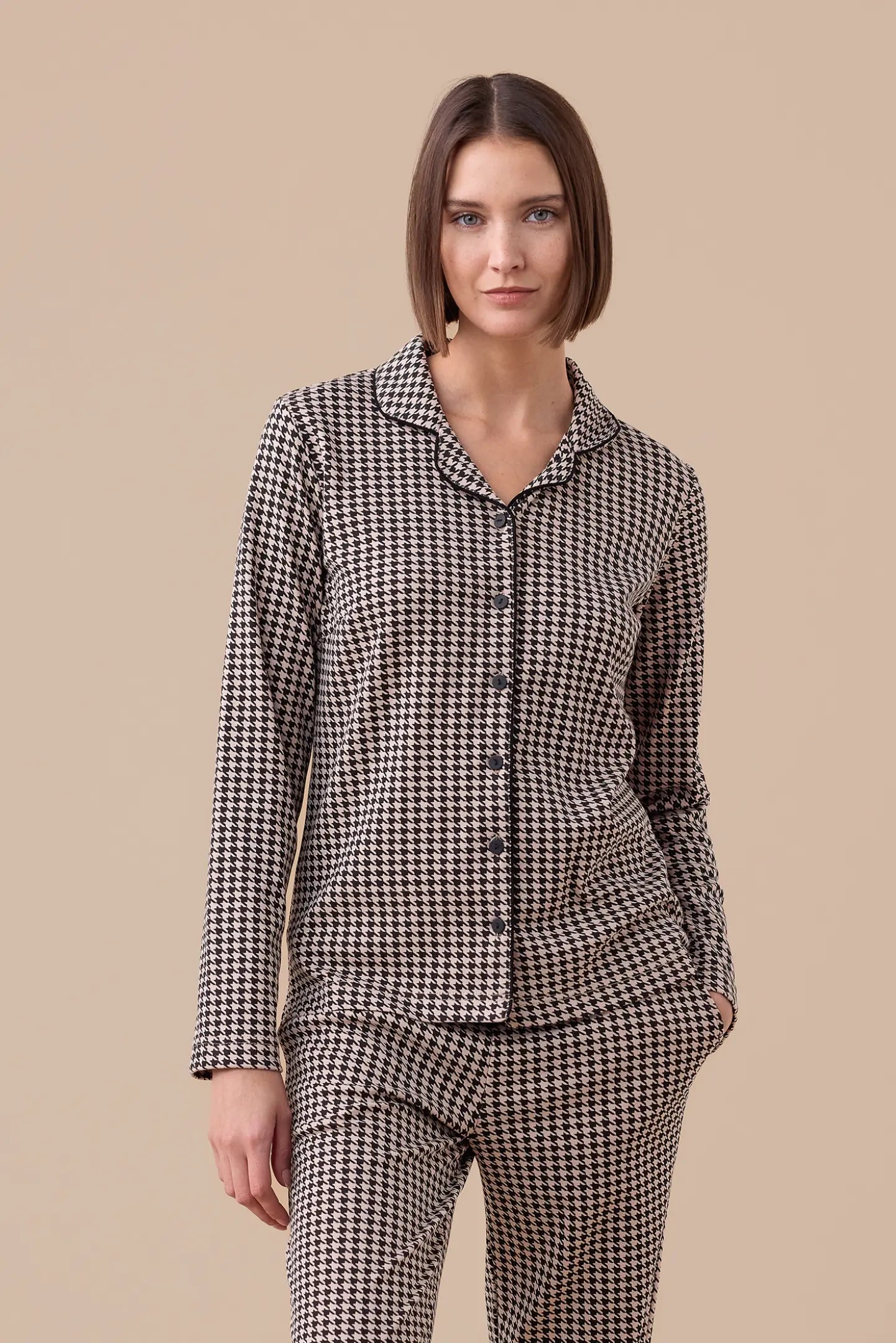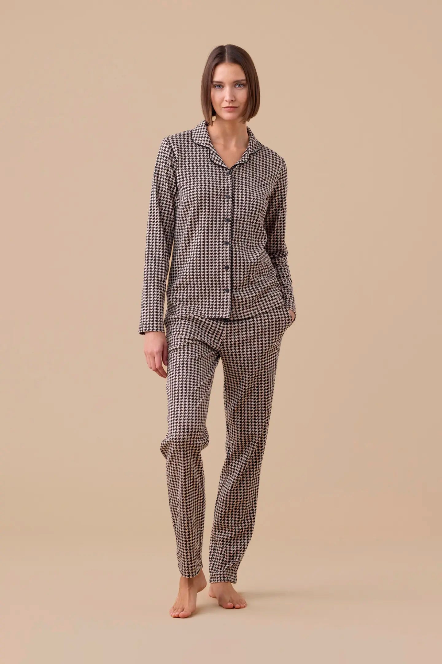 Ζεστές γυναικείες βαμβακερές πιτζάμες με σχέδιο pied de poule, ανδρικό τοπ με τελείωμα σε αντίθεση και παντελόνι με τσέπες.με ανδρικό σχέδιο