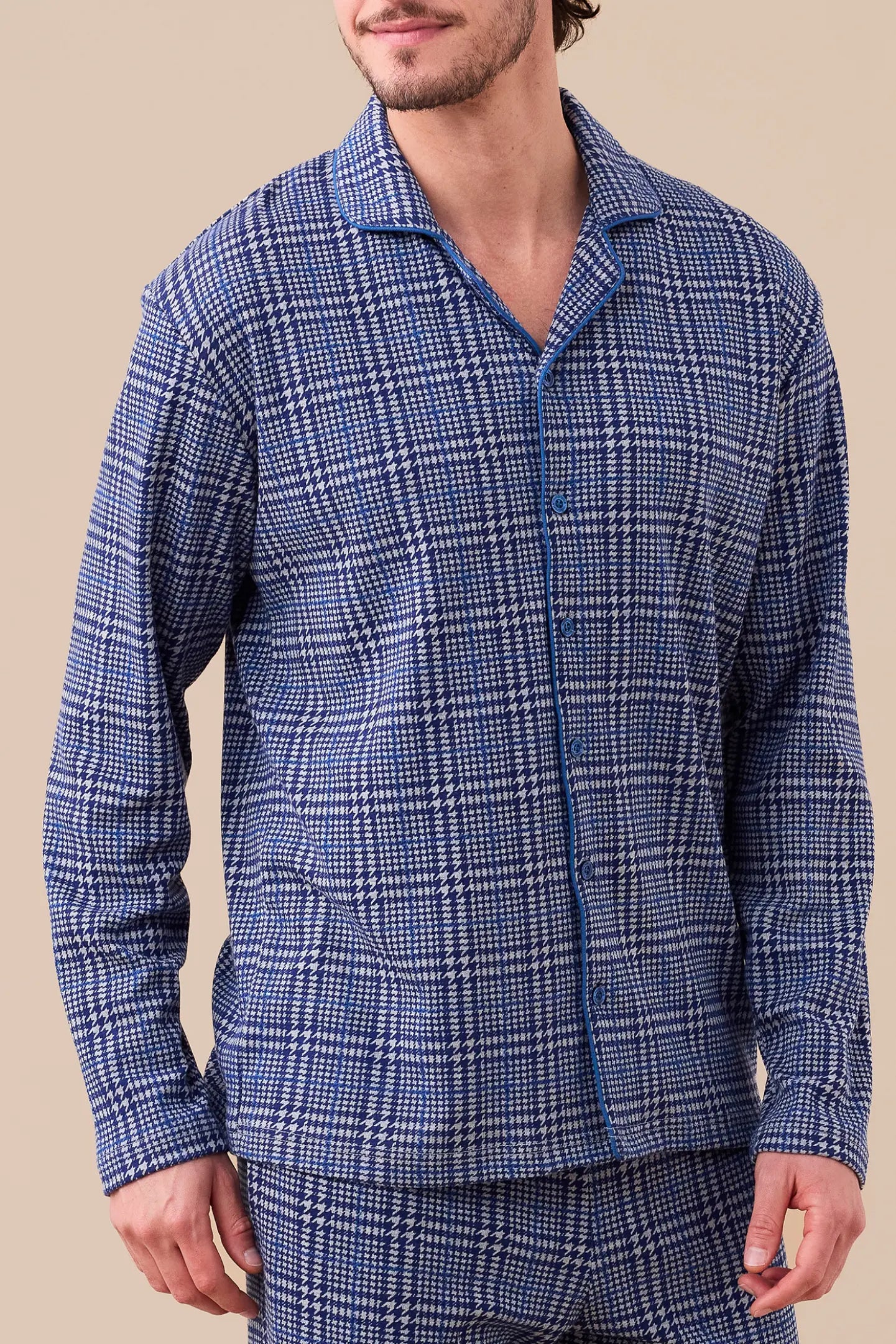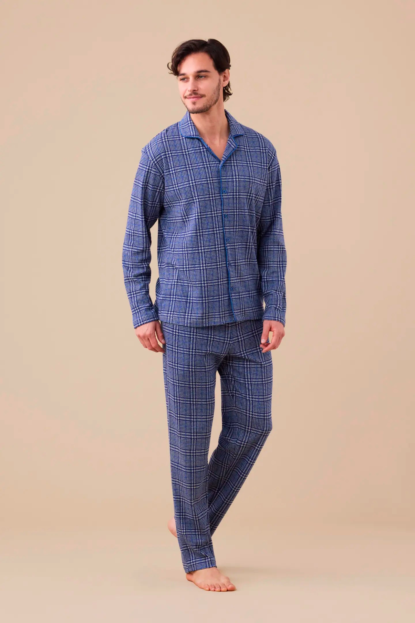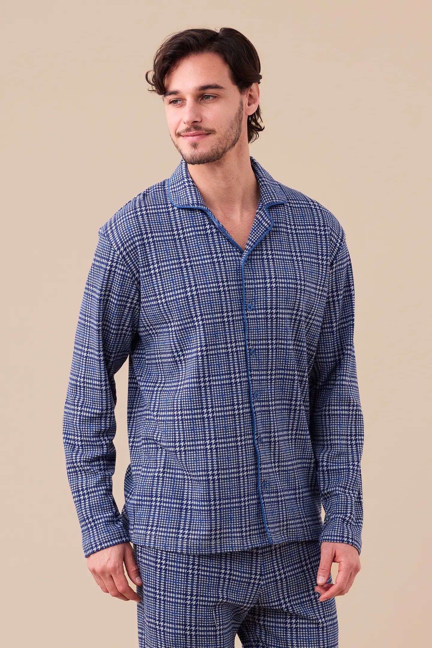 Ζεστή βαμβακερή πιτζάμα για άνδρες, ανδρικό τοπ με κουμπιά μπροστά σε ταρτάν print και παντελόνι ταρτάν print.