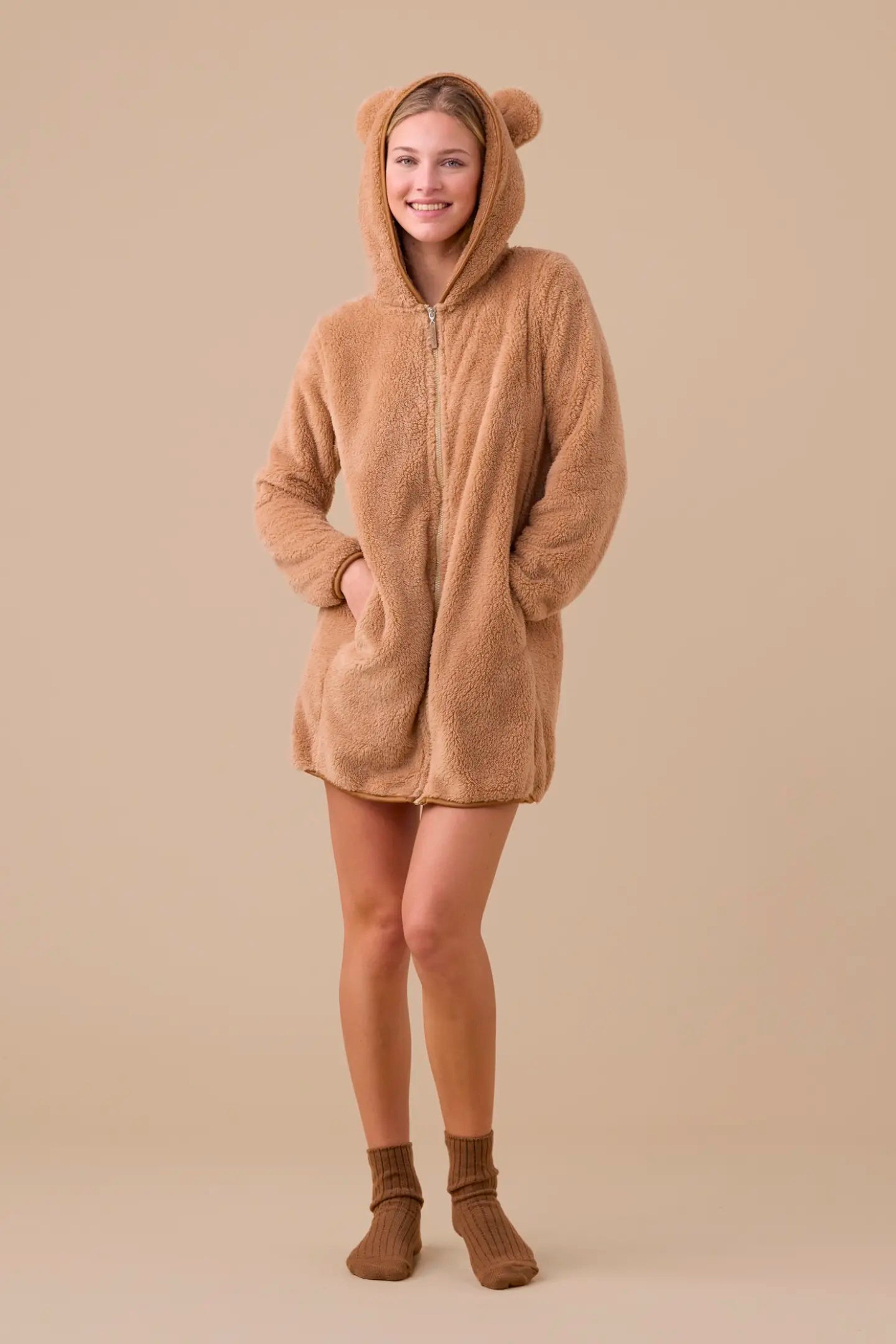 Γυναικεία ρόμπα από ψεύτικη γούνα με φερμουάρ και κουκούλα, χαριτωμένα αυτιά και τσέπες.